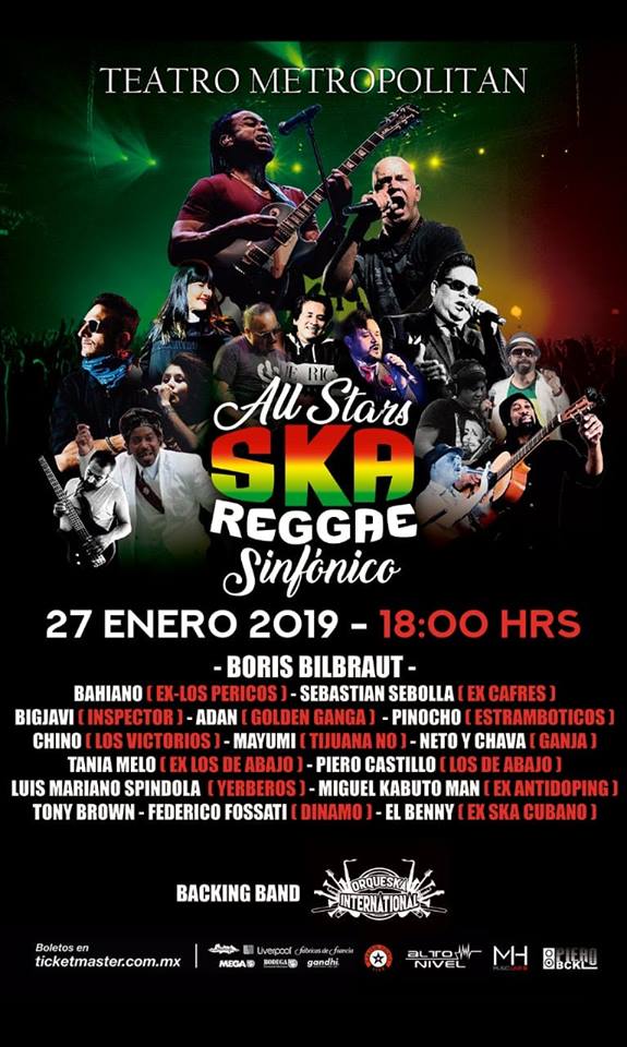 Con la presencia de la Orqueska Internacional, representantes de ambos géneros, como Boris Bilbraut de Cultura Profética, Martín Moska Lorenzo, de Auténticos Decadentes; Bahiano, ex Pericos; Sebastián Sebolla, de Los Cafres; Big Javy, de Inspector; Pinocho de Estrambóticos; Piero Castillo, de Los de Abajo; Miguel Kabuto, ex Antidoping; entre otros artistas, son los convocados para hacer vibrar a sus seguidores en la Ciudad de México desde el escenario del Teatro Metropolitan.