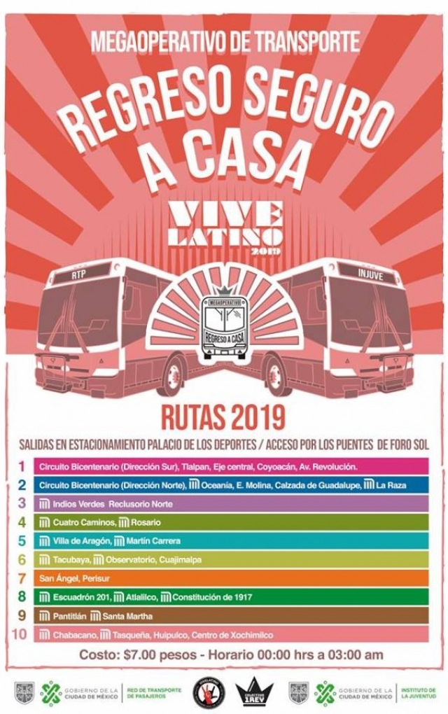 El costo del pasaje por usuario será de siete pesos y los autobuses saldrán del estacionamiento de la puerta 1 del Palacio de los Deportes, en un horario de medianoche (24:00) del sábado y domingo a las 3:00 horas del día siguiente, con los siguientes trayectos: