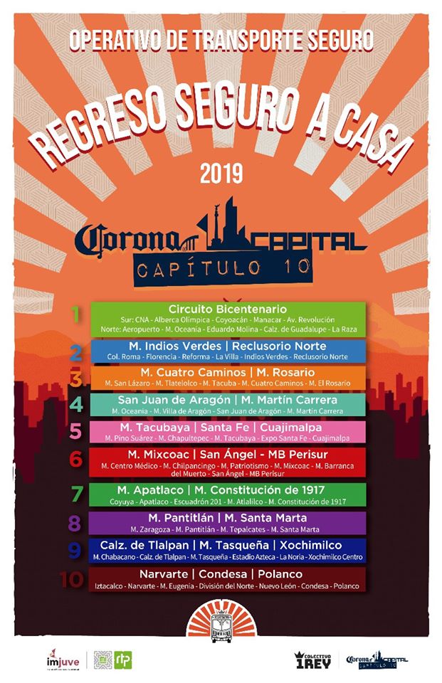El gobierno de la Ciudad de México habilitará el operativo Regresa Seguro A Casa, a través de la Red de Transporte de Pasajeros (RTP), para garantizar el traslado nocturno de los asistentes a la décima edición del Festival Corona Capital, que se realizará los días 16 y 17 de noviembre en la Curva 4 del Autódromo Hermanos Rodríguez.