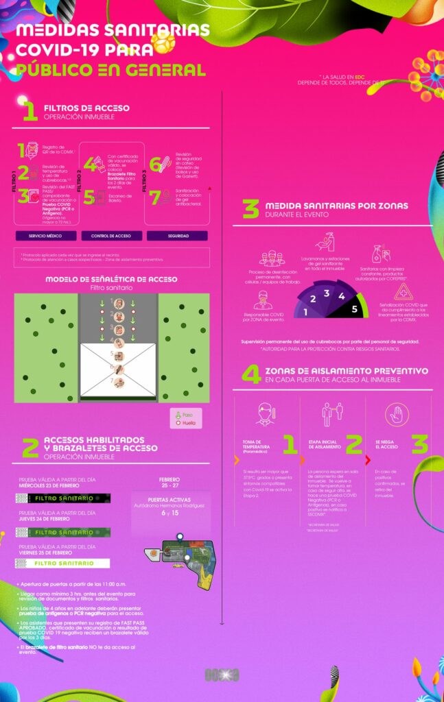 Cabe resaltar que en cada acceso al venue, habrá una zona de aislamiento preventiva por Covid-19, es decir, que se tomará la temperatura y si la persona registra más de 37.5 grados Celsius o “presenta síntomas compatibles con Covid-19” se le dirigirá a una “sala de aislamiento”, donde se le volverá a tomar la temperatura. En caso de continuar alta, se le realizará una prueba Covid-19. “En caso positivo se notifica a la Secretaría de Salud de la Ciudad de México. En caso de positivos confirmados, se retira” del lugar.