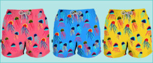Los colores rosa salmón , amarillo mostaza y azul cielo con los colores de las medusas que varían en los tonos que pintan al traje y el diseño de las medusas ¡se convertirán en tu favoritos esta primavera!