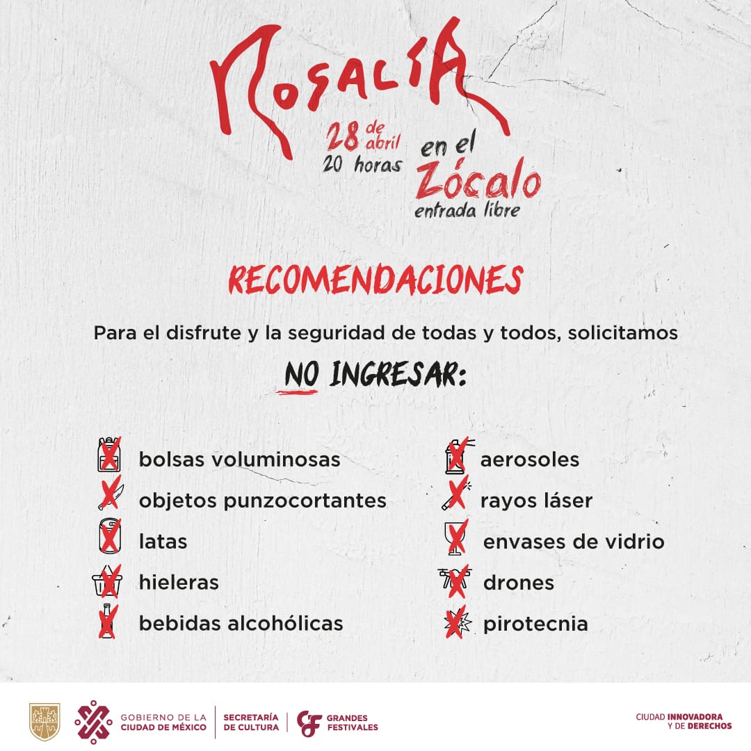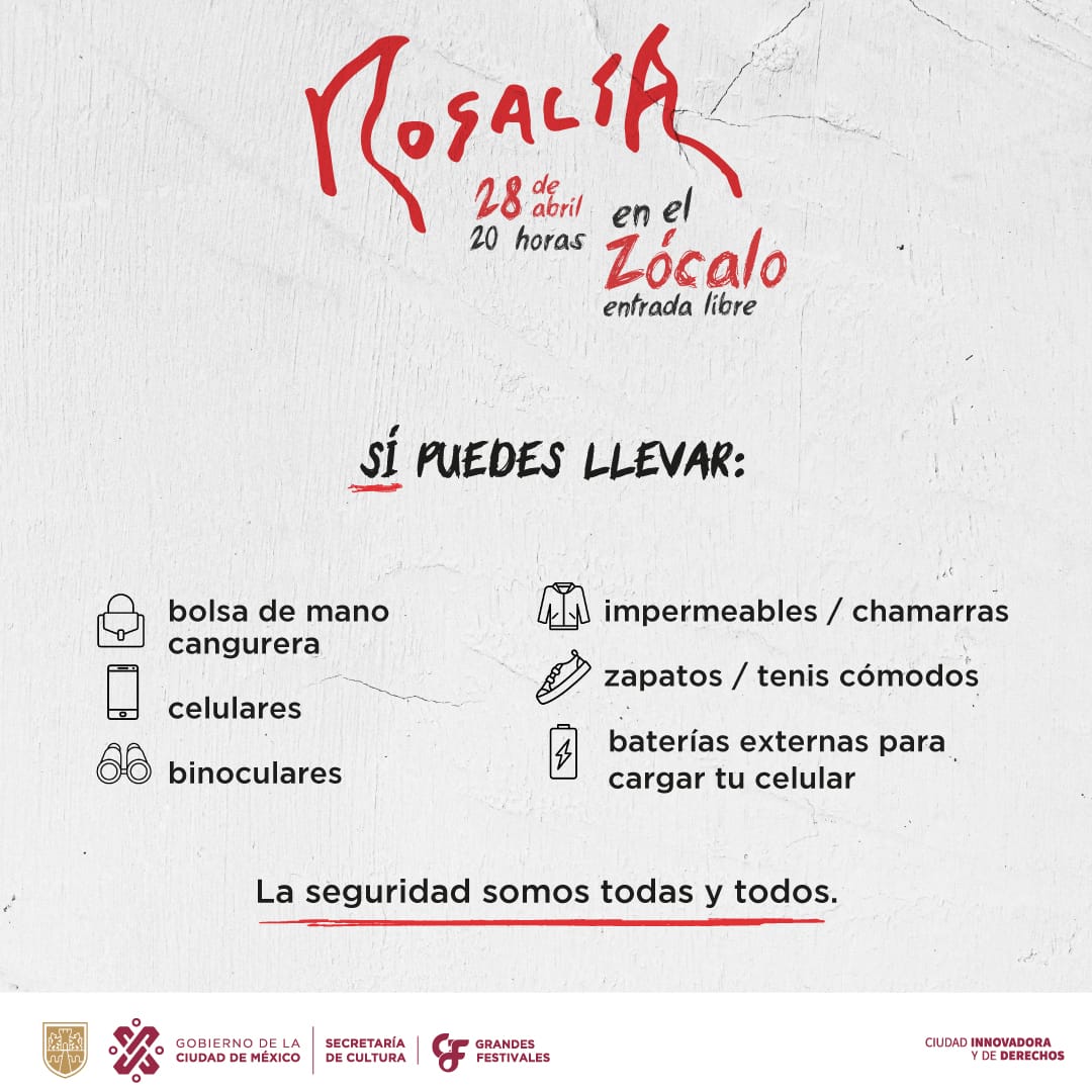 Actualización. Autoridades de la Ciudad de México emitieron una serie de recomendaciones a seguir por quienes acudan este viernes 28 de abril al concierto que Rosalía ofrecerá, a partir de las 20:00 horas, en el Zócalo, el cual será el broche de oro para su exitoso Motomami World Tour por el continente americano.