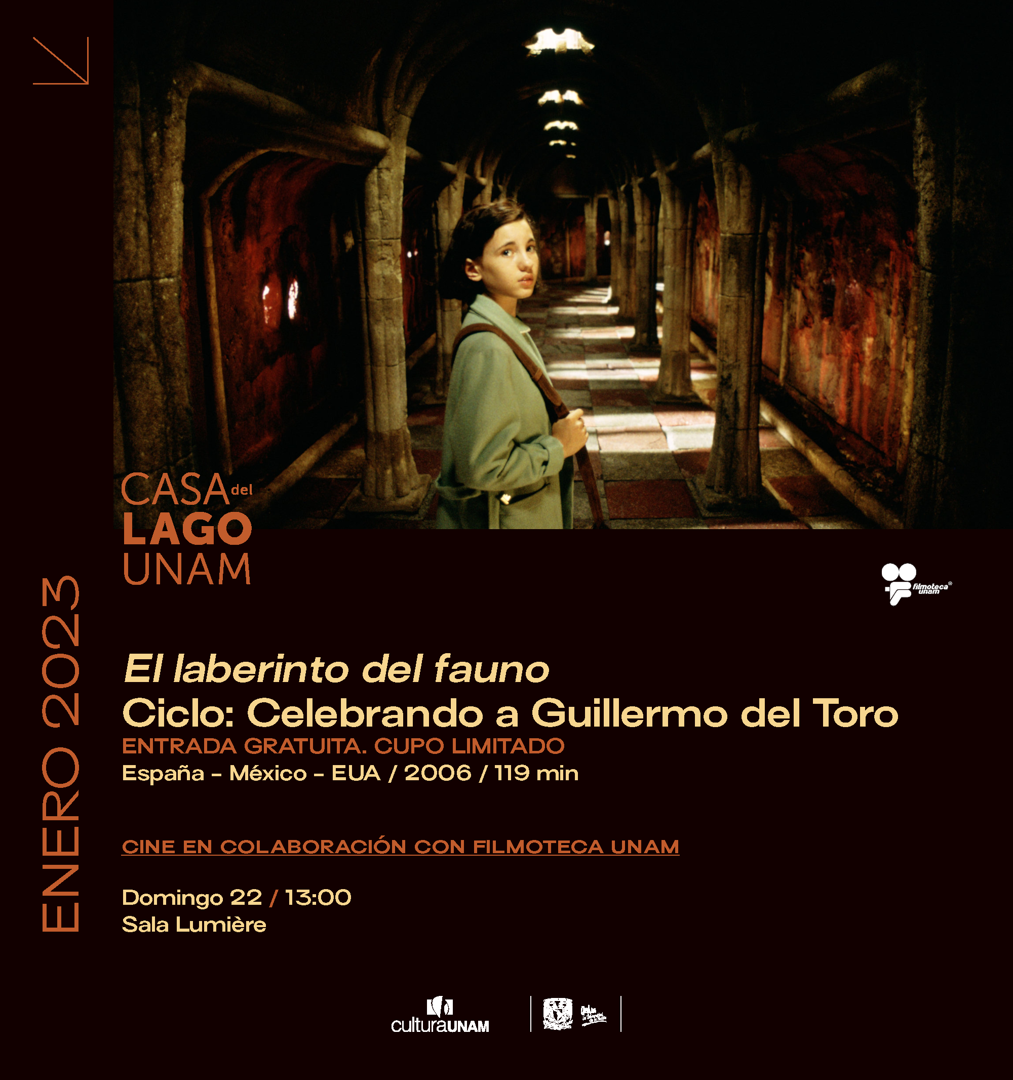 Un día después, el 22 de enero a las 13:00 horas, será el turno de El Laberinto del Fauno (España – México – EU, 2006), que narra la historia de la pequeña Ofelia, cuyo padrastro, el capitán Vidal, es un hombre cruel que encabeza el ejército franquista de España de la posguerra, y su misión es eliminar a los últimos republicanos. “Ofelia es introducida al paralelismo de un mundo fantástico a través de un laberinto donde habita un fauno, quien le hace saber que ella es en realidad la princesa de un reino de fantasía que espera su regreso”, detalla el comunicado de la Coordinación de Difusión Cultural de la UNAM.