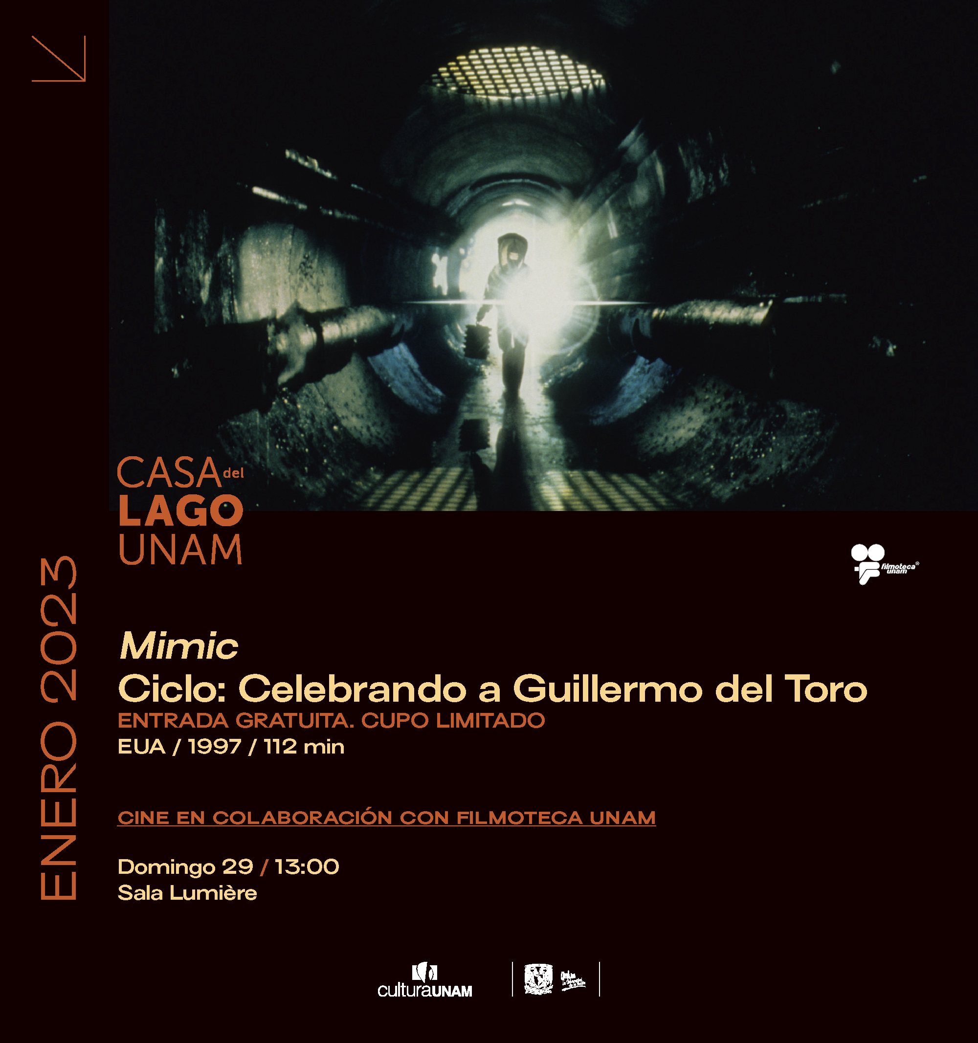 También estará Mimic (EU, 1997), el domingo 29 de enero a las 13:00 horas, película basada en el cuento homónimo de Donald A. Wollheim, cuyo guión fue escrito por Guillermo del Toro y Matthews Robbins, y en la que aborda la historia de una enfermedad propagada por cucarachas que provoca muertes entre la población infantil de Manhattan. En un intento para contrarrestar la epidemia, la directora Susan Tyler realiza una mutación entre insectos para crear una nueva especie que secreta una sustancia que extermina a las cucarachas. Empero, aunque esa nueva especie fue programada para morir tras su primera generación, extrañas desapariciones se han suscitado en los últimos días.