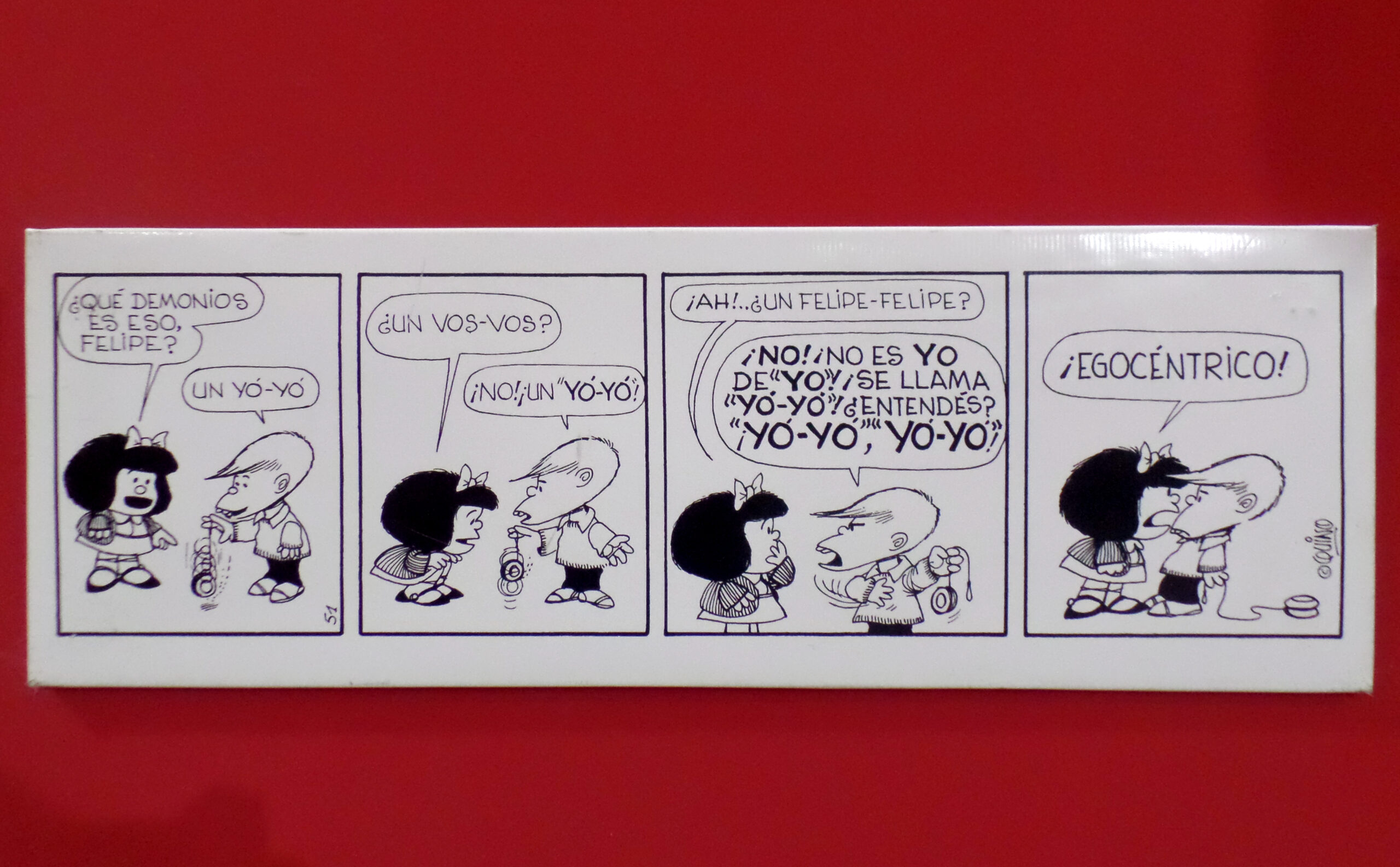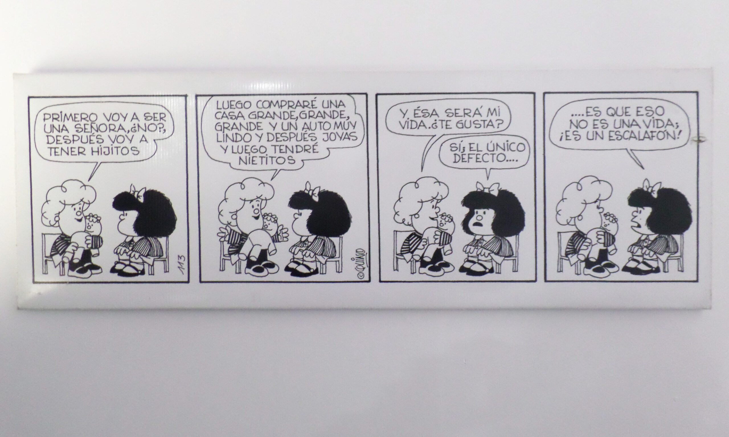 La exposición te sumerge en las frases con las que la creación más famosa de Quino siempre cuestionó los estereotipos, la discriminación, la desigualdad social y el machismo para que puedas ver el mundo desde la perspectiva de la pequeña niña. Foto @Ok_Tania