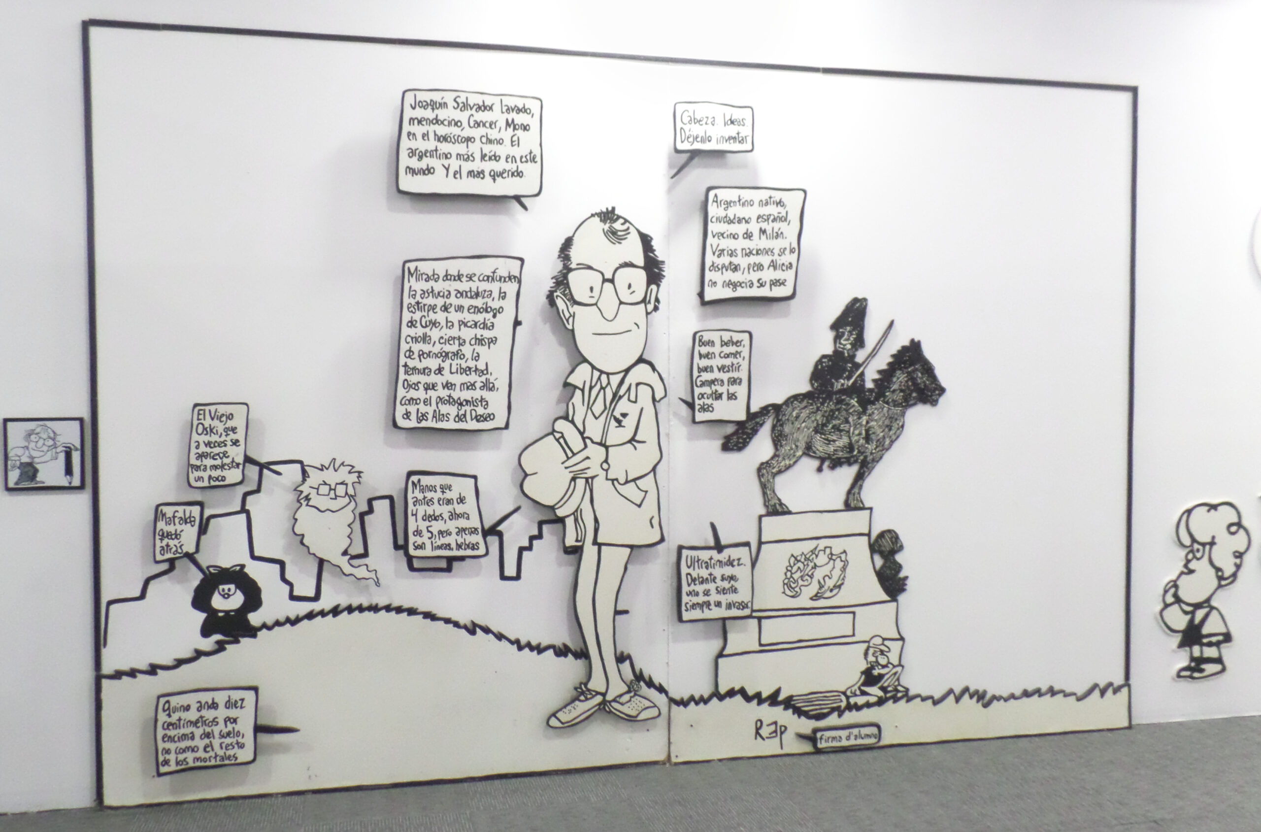 La estrella de la historieta argentina, que desconcierta con frecuencia a los adultos con sus cuestionamientos sobre lo socialmente establecido y la política, muestra un poco de sus reflexiones sobre el acontecer mundial, con su agudo sentido del humor, a través de una selección de viñetas de gran tamaño que remiten no sólo a la nostalgia mediante el talento de Joaquín Salvador Lavado Tejón, famoso en el mundo como Quino, sino que sorprende a sus (asistentes) invitados en plena sonrisa, como lo ha hecho con varias generaciones desde la década de los 60, tras leer y releer sus famosas frases.