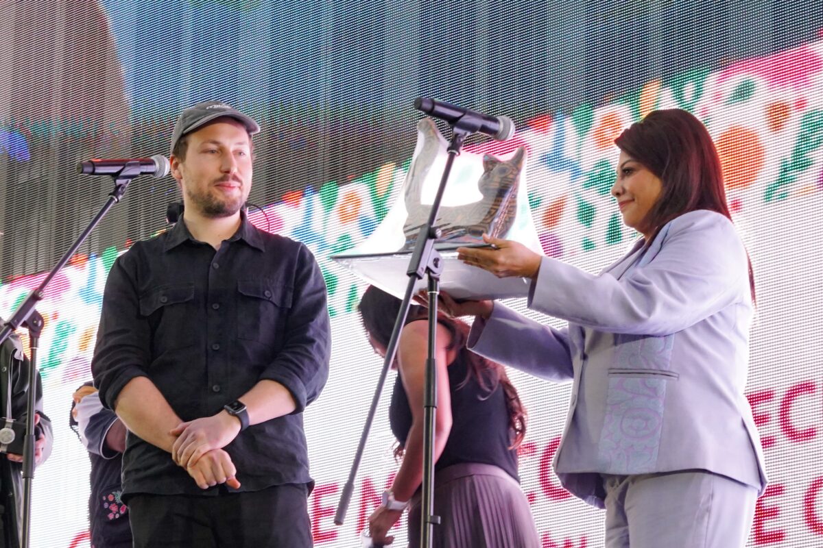 “Usted, con su arte nos recuerda que con ternura se puede transformar este mundo y que una historia sin palabras lo puede decir todo y a ustedes niñas y niños los invito a seguir soñando, a imaginar y a sentir, porque los sueños que tengan hoy puedan cambiar este mundo el día de mañana”, expresó la funcionaria quien entregó al director de cine una figura de un gato realizada en arte huichol.