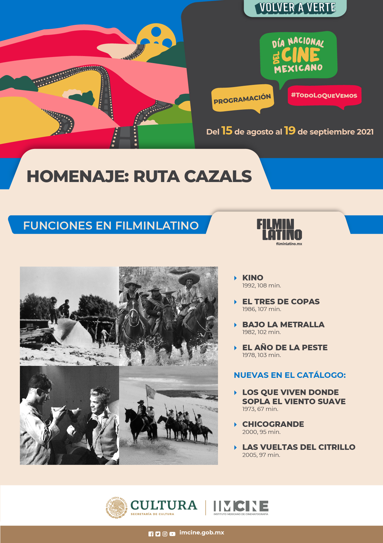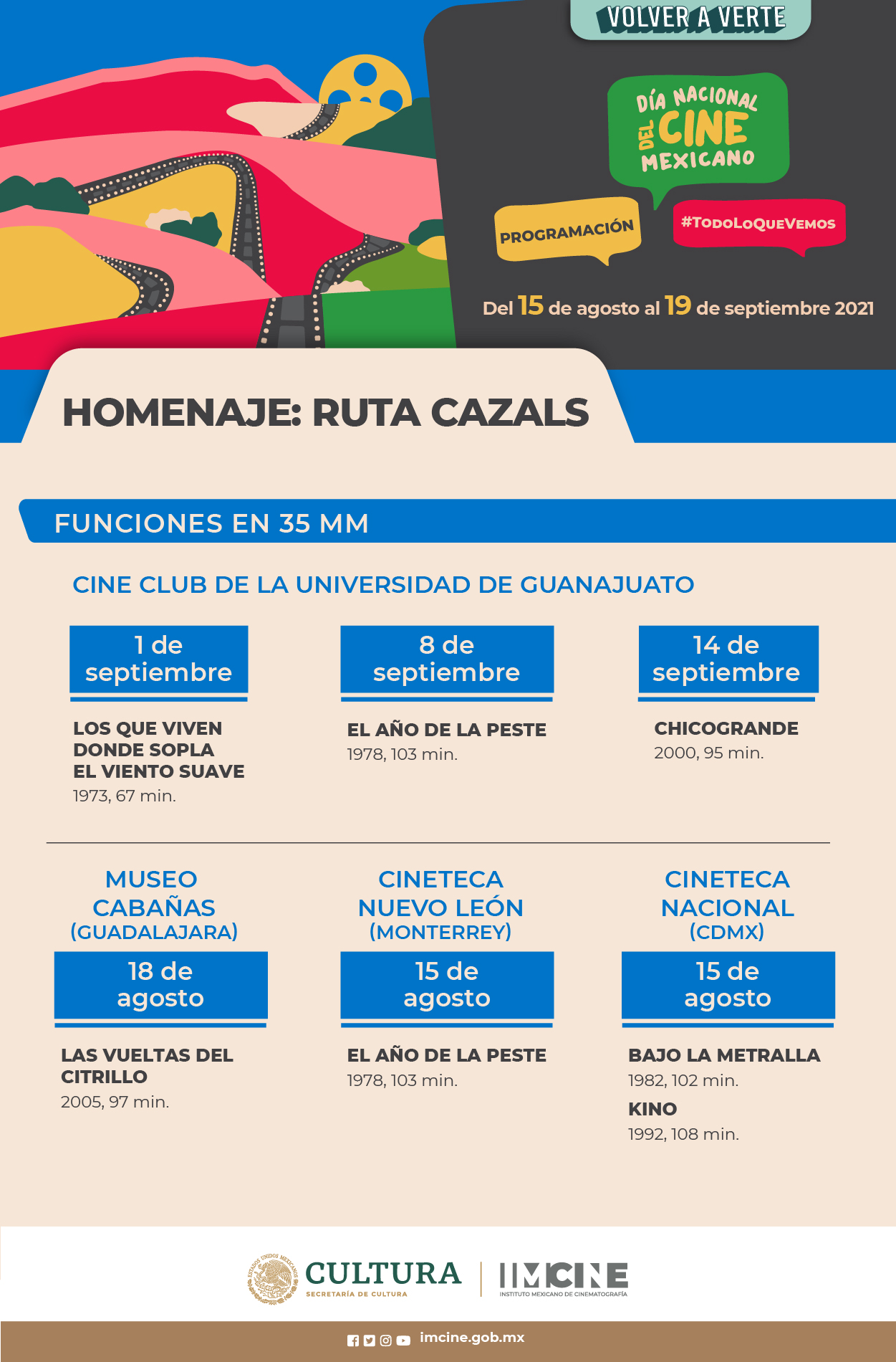 El platillo especial de este festejo es el ciclo Ruta Cazals, que invita a explorar la travesía crítica e histórica del cineasta Felipe Cazals. “El homenaje está conformado por ocho largometrajes dirigidos por el maestro entre 1973 y 2005: Los que viven donde sopla el viento suave (1973), El Año de la Peste (1978), Chicogrande (2000), Las vueltas del citrillo (2005), Bajo la metralla (1982), Canoa (1976) y El Tres de copas (1986).