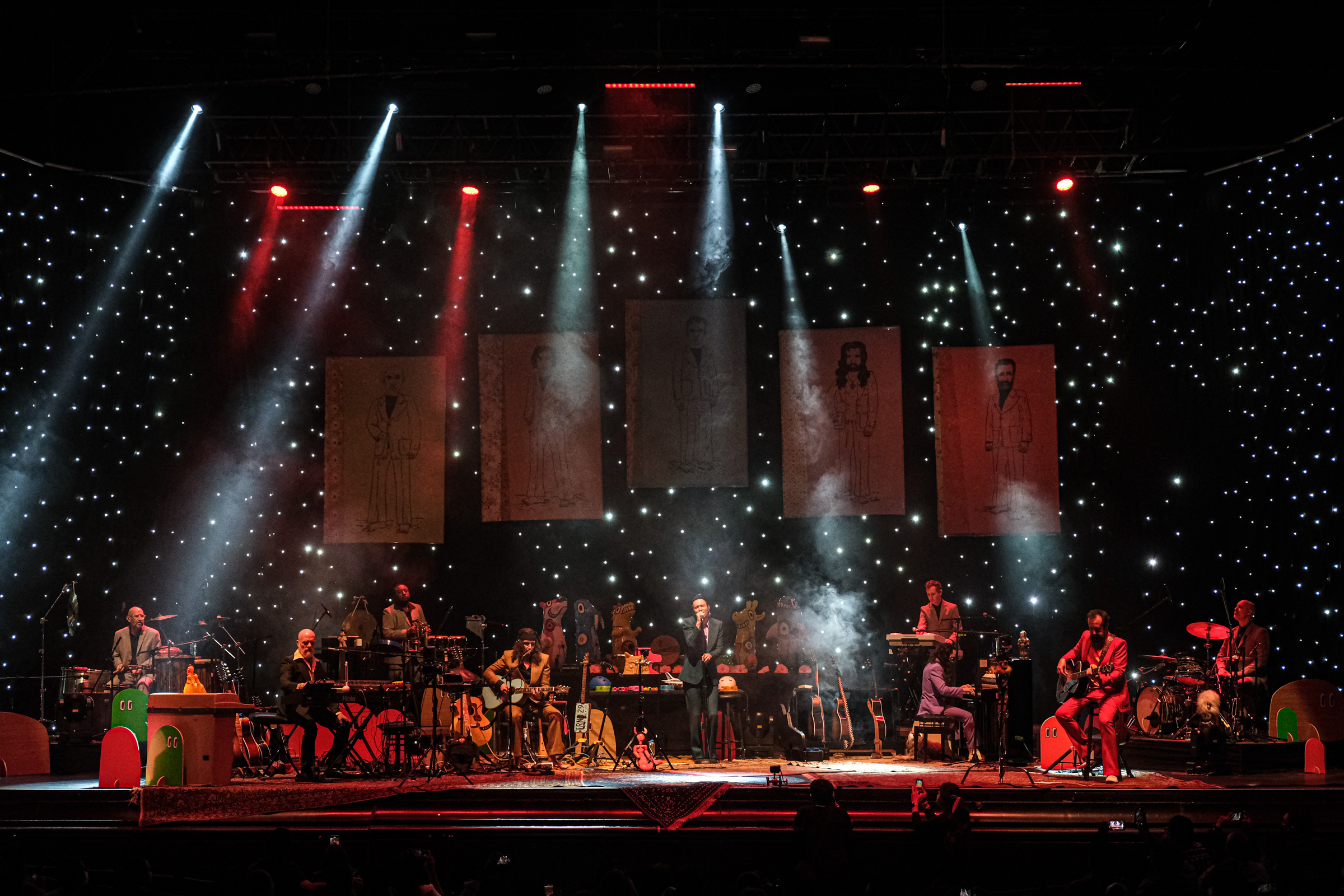 Leonardo de Lozanne, vocalista de Fobia, frente a las esculturas de Cabo San Roque en el Teatro Metropolitan, el 11 de marzo de 2022. Foto Ocesa / Liliana Estrada