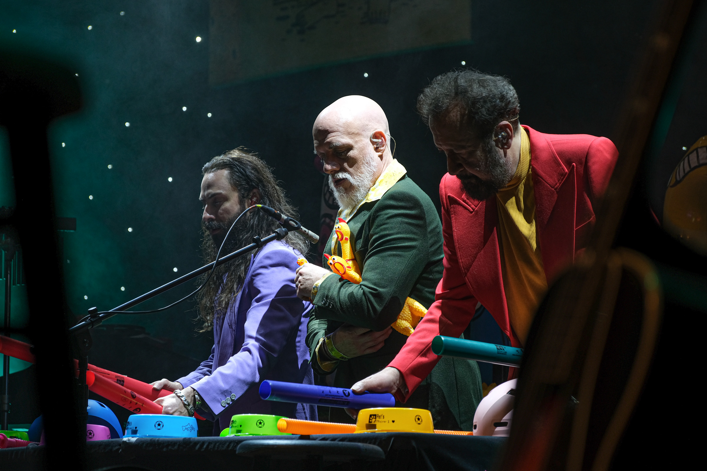 De pronto, una figura de canino que había estado muy cerca del multi-instrumentista- Jay de la Cueva, casi a sus pies, se incorporó y comenzó a caminar lentamente para sorpresa del público. Antes, con sus orejes para el ruido, parecía parte de la escenografía con la que la banda adornó el escenario. “Se llama Arepa”, dijo de Lozanne “Y nos ha acompañados en todos los ensayos en el escenario”, agregó al tiempo que se incorporaba después de acariciarle. Y mientras Arepa se volvía a acomodar sonó un fragmento de Black Bird de The Beatles, un emotivo puente para enfilar los Caminitos Hacia el Cosmos.