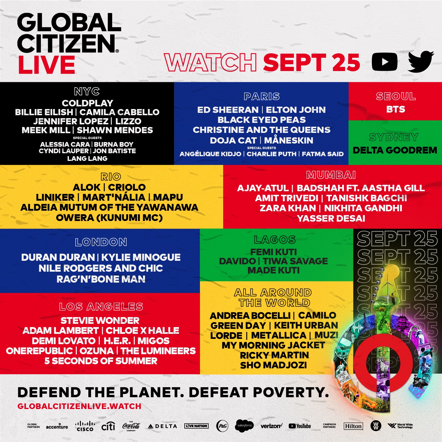 Con un festival que se llevará a cabo desde diferentes puntos del planeta, la ONG Global Citizen unirá el talento y las voces de artistas como Stevie Wonder, Billie Eilish, Metallica, Ed Sheeran, Coldplay, Green Day, Andrea Bocelli, Lorde, Elton John, The Weeknd, BTS, Ricky Martin, Duran Duran, Shawn Mendes, entre muchos más, para exigir a los líderes mundiales que actúen “frente a las amenazas más urgentes que golpean” al planeta.