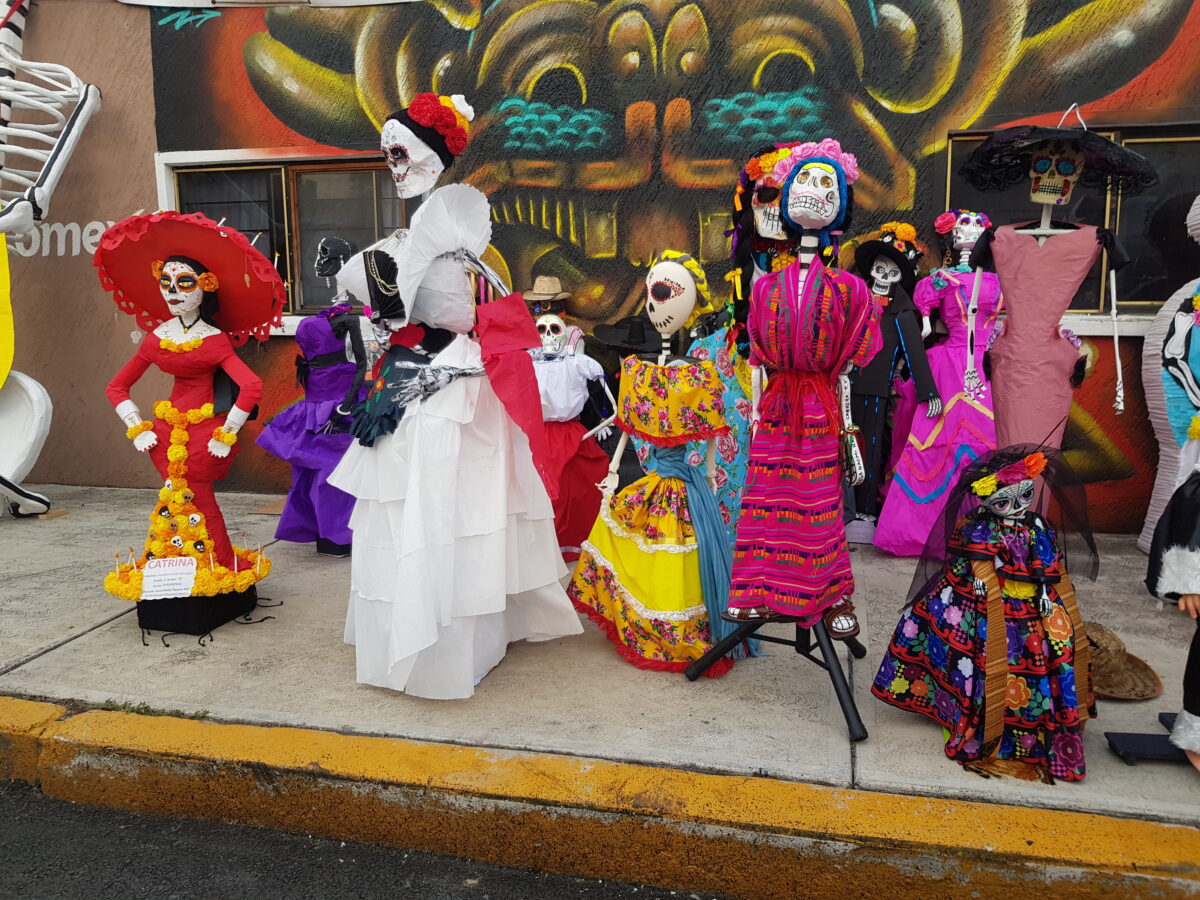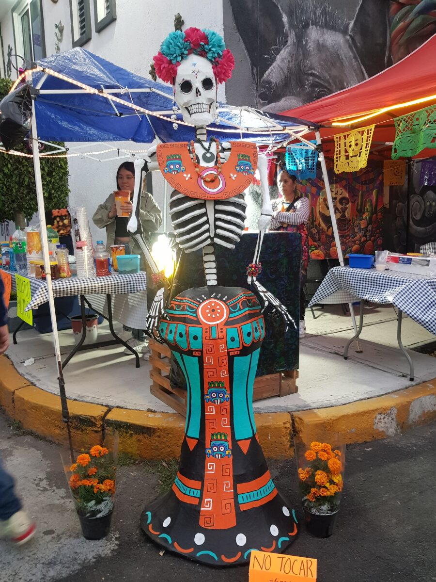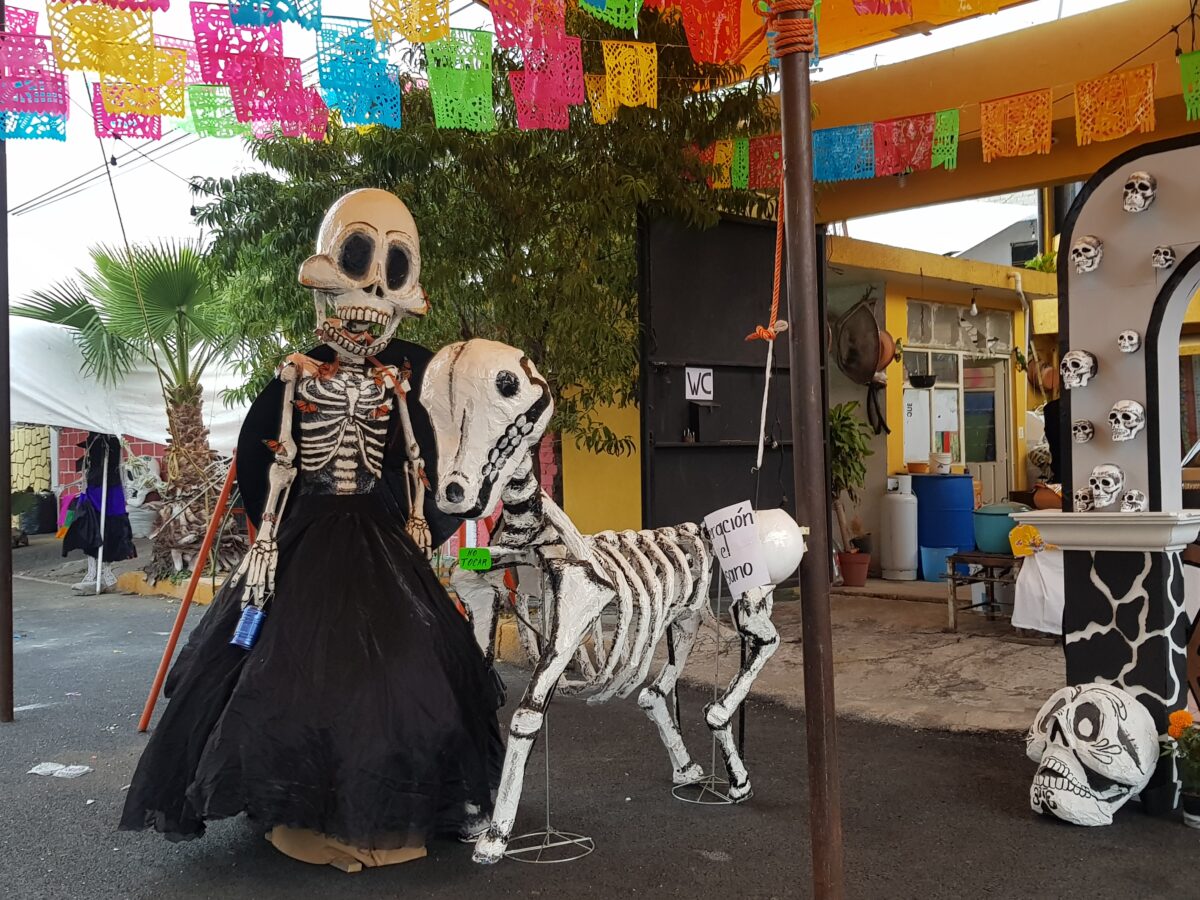 También en la esquina de Borraz y Enrique Lombardo, un grupo de catrinas, dispuestas en tres filas, parecían esperar a que alguien las invite a bailar al ritmo que, desde la tornamesa, las Musas Sonideras, impusieron. Más allá suena una música tradicional, que parece provenir de un tambor y flauta, mientras cuatro esqueletos danzantes realizan la ceremonia ritual de los voladores, originaria de los pueblos mesoamericanos.