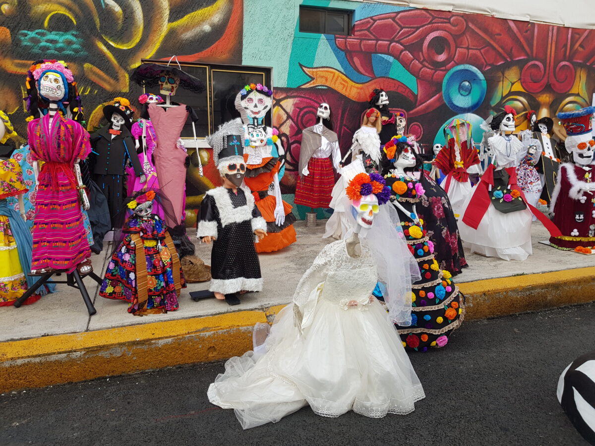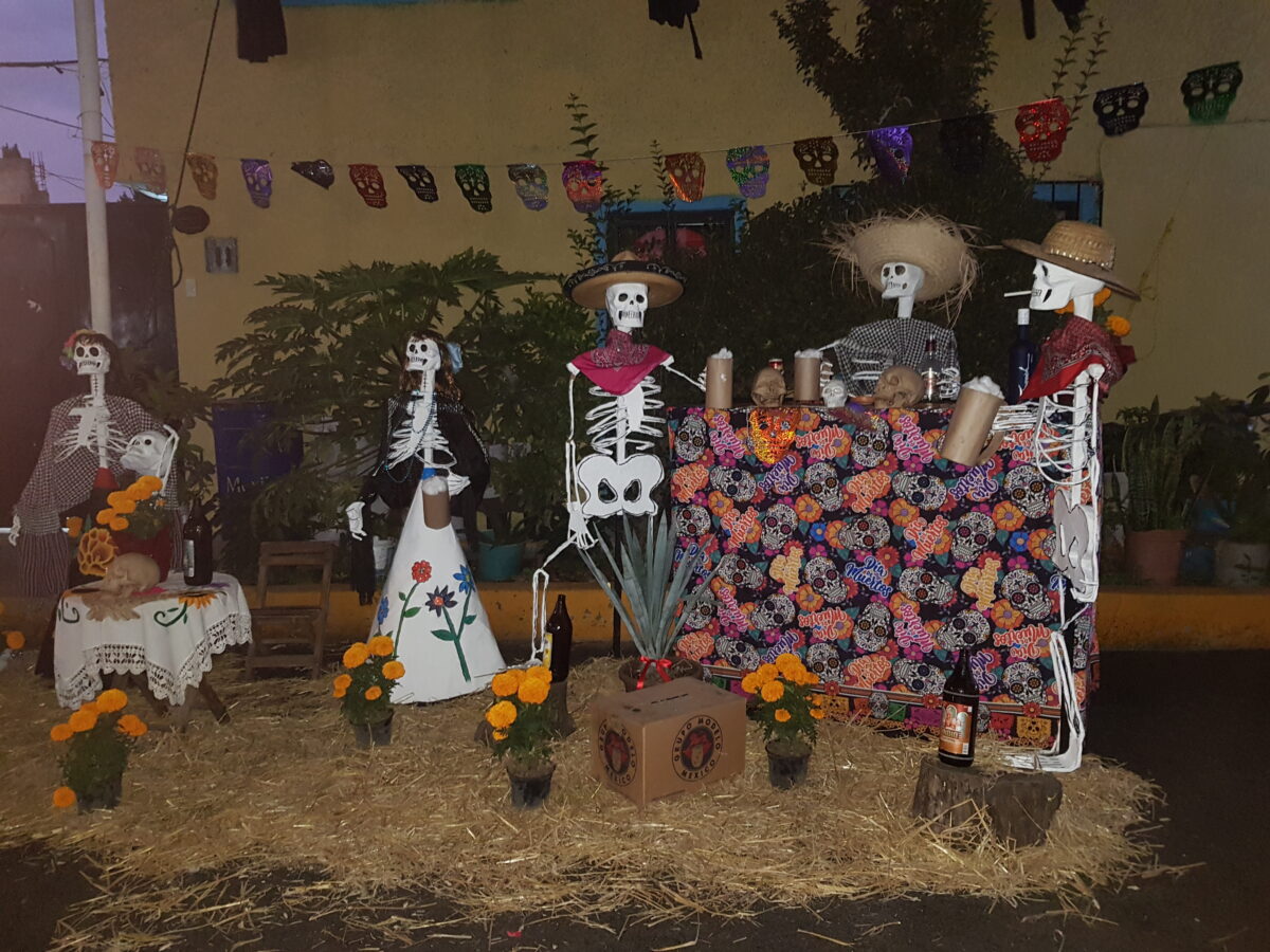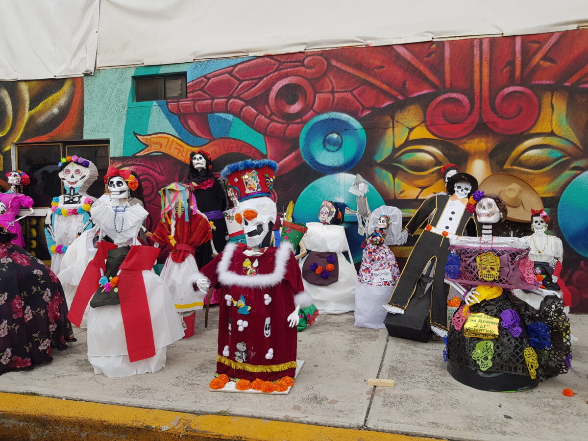 También en la esquina de Borraz y Enrique Lombardo, un grupo de catrinas, dispuestas en tres filas, parecían esperar a que alguien las invite a bailar al ritmo que, desde la tornamesa, las Musas Sonideras, impusieron. Más allá suena una música tradicional, que parece provenir de un tambor y flauta, mientras cuatro esqueletos danzantes realizan la ceremonia ritual de los voladores, originaria de los pueblos mesoamericanos.