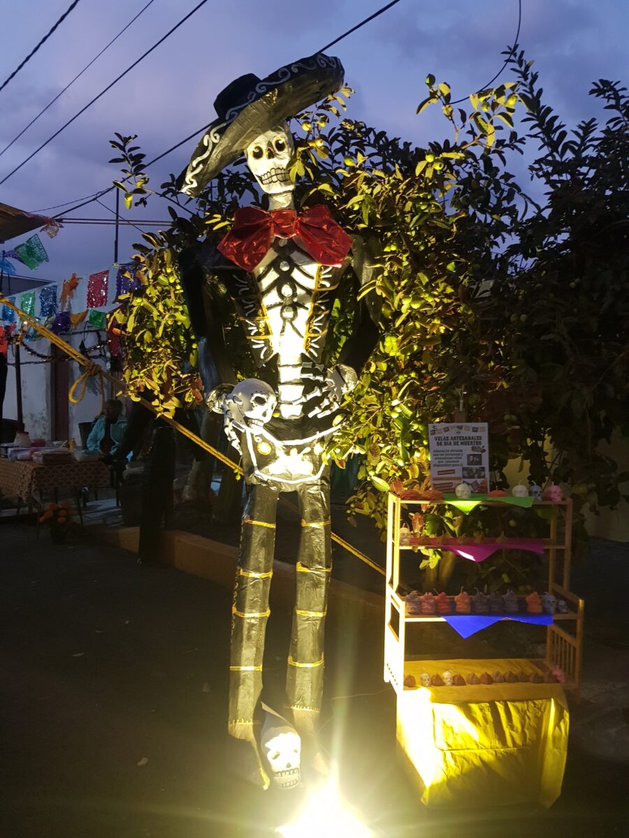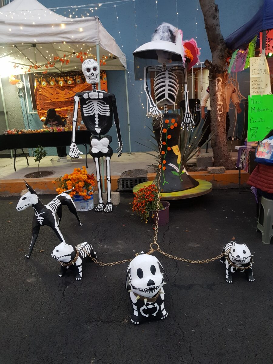 Así, iban aprendiendo (e) iban adornando sus fachadas, pero era curioso, pues había una fachada decorada en una cuadra y otra en otra cuadra. Éramos apenas ahí unas manifestaciones. De ahí nace todo esto de expandir hacia las cinco calles este trabajo de cartonería”, que este 2024 se manifestó en esqueletos de diversos tamaños: desde bustos monumentales con alas de mariposa monarca o sentadas ante una enorme mesa en la que se dispuso una ofrenda, hasta aquellas con elegantes y floridos vestidos y sombreros, otras con máscaras de luchador o con smoking.