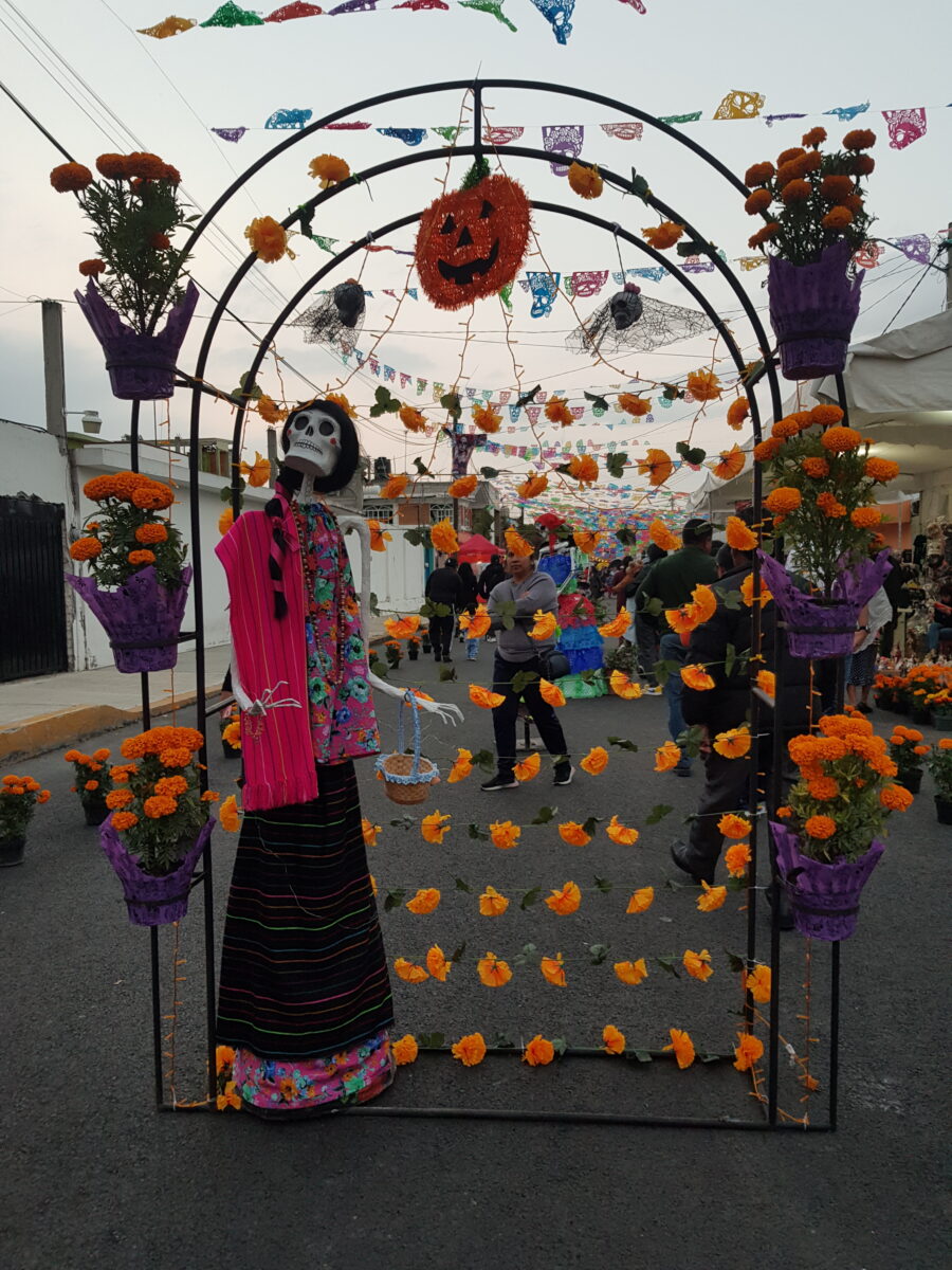 Los coloridos cuadros de plástico que emulan el papel picado que se coloca en las ofrendas, por sus motivos de calaveras, dan la bienvenida, al ritmo que el viento les impone, a una calle en la alcaldía Tláhuac que cada año, desde 2011, por Día de Muertos, adquiere una atmósfera festiva, durante el periodo que es ‘tomada’ por las Calaveras Gigantes, que este año fue presentado bajo el nombre Tecuán-Tláloc.