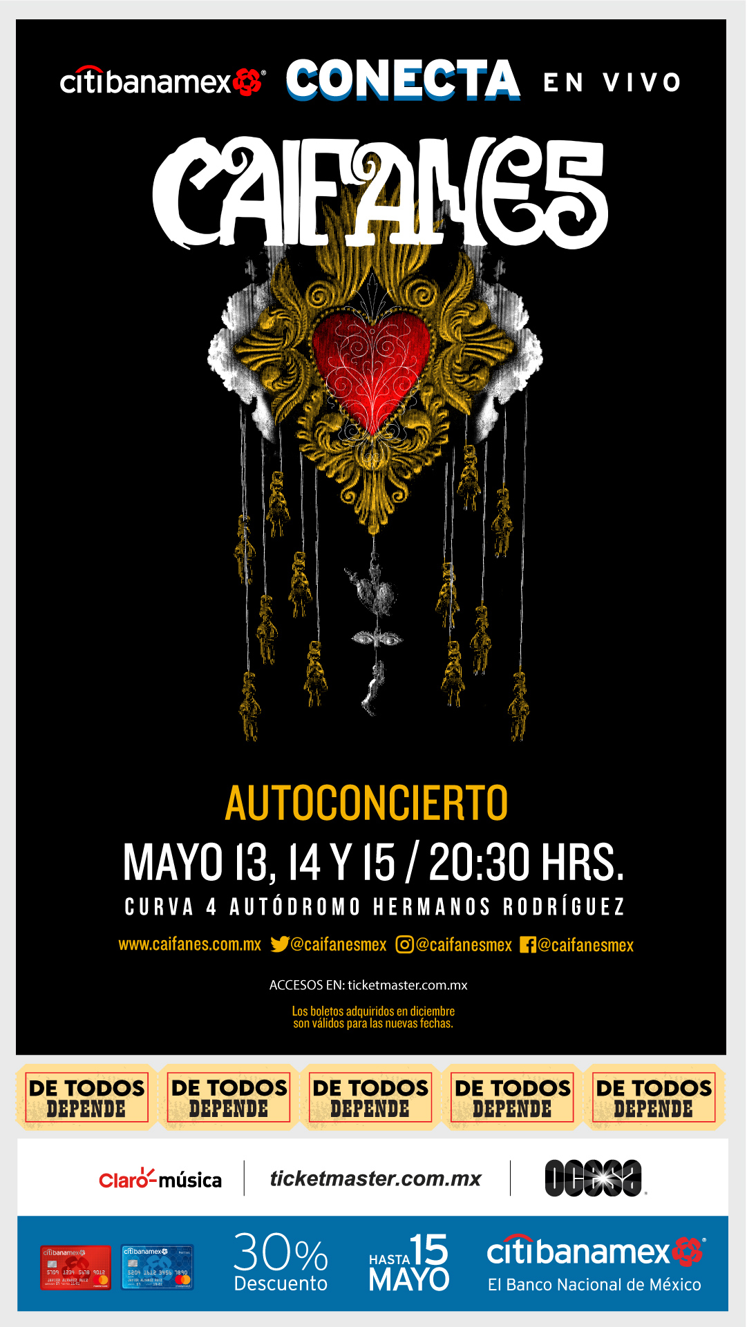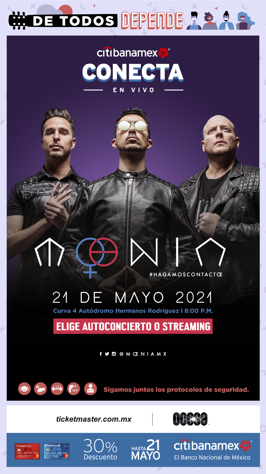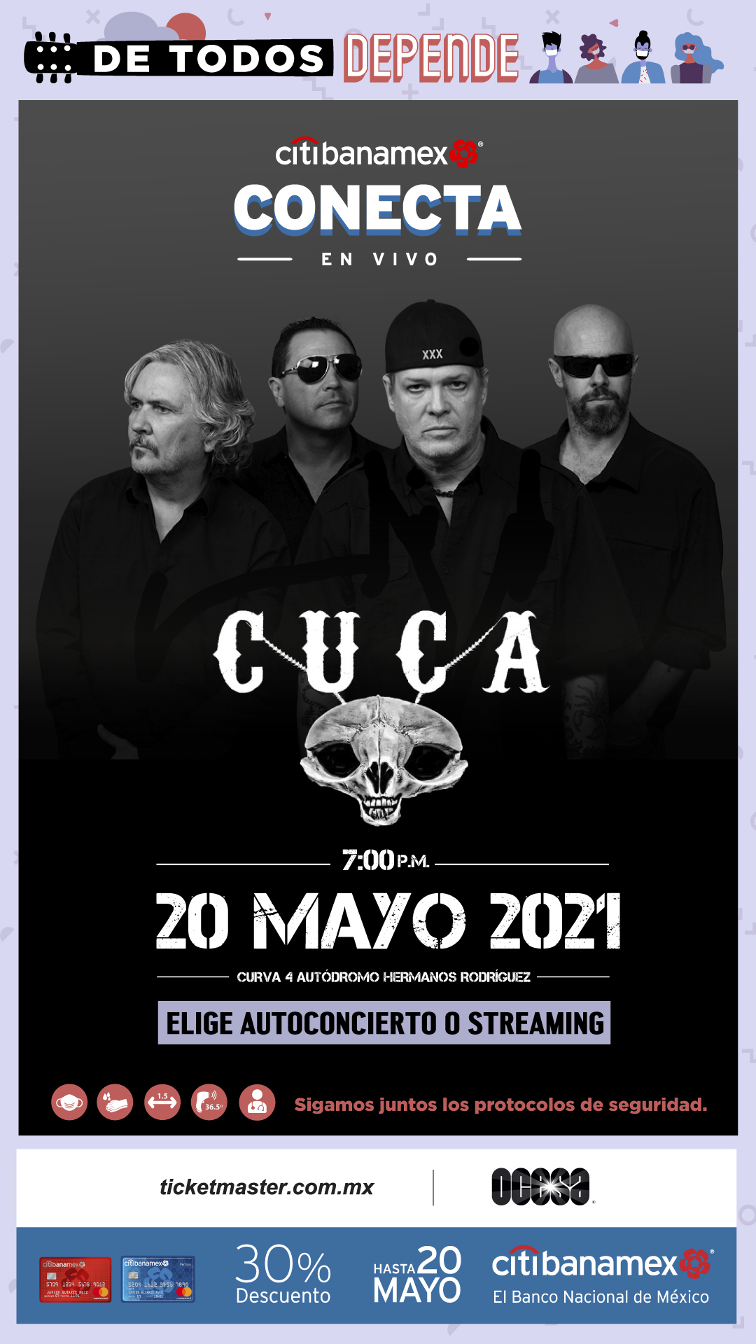 Tras meses de suspensión de eventos musicales en vivo, llega la serie de autoconciertos denominada Conecta en Vivo, la cual se realizará a partir del 13 de mayo, cuando el grupo Caifanes llegue a la Curva 4 del Autódromo Hermanos Rodríguez, bajo el protocolo de medidas sanitarias implementadas por las autoridades de la Ciudad de México.