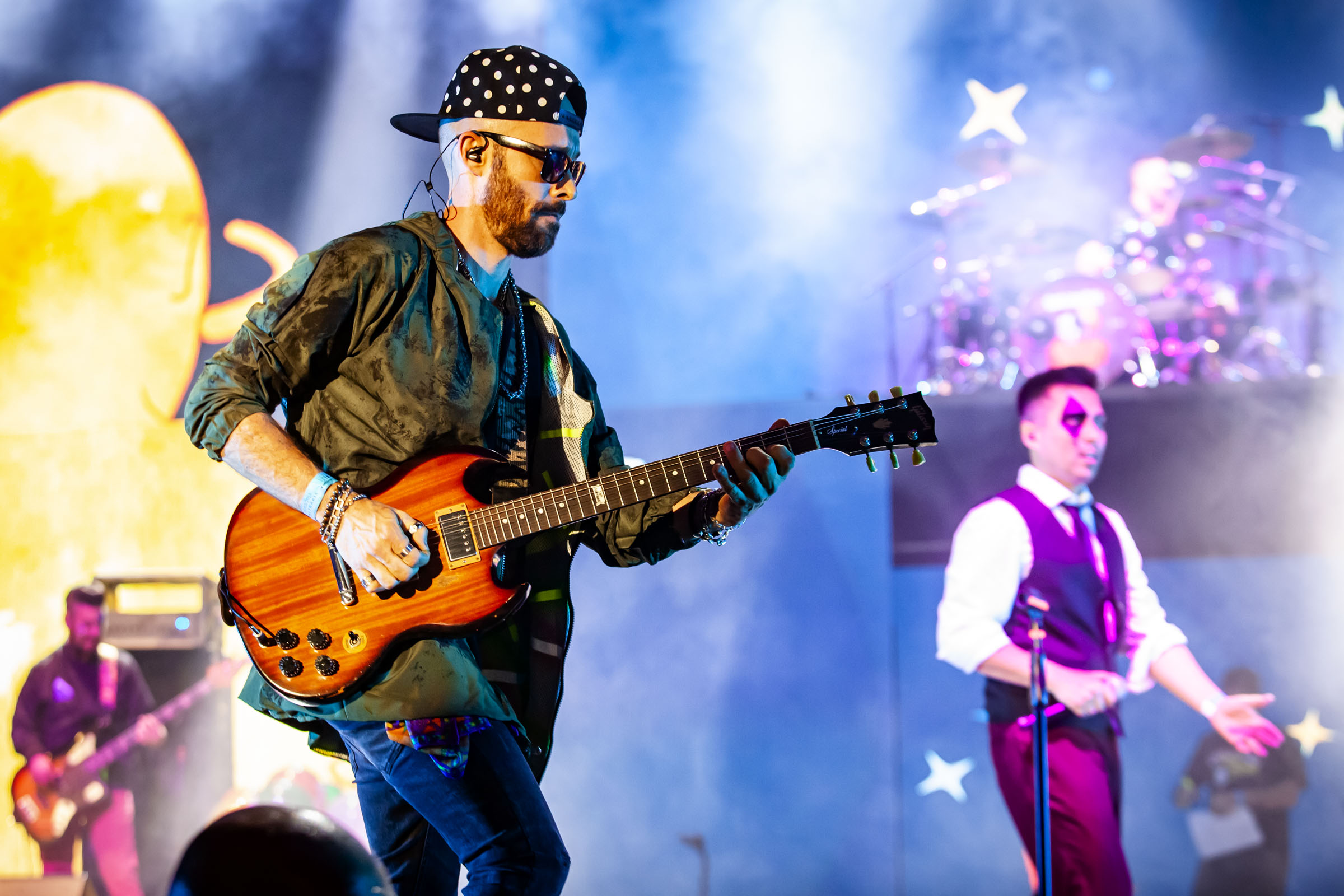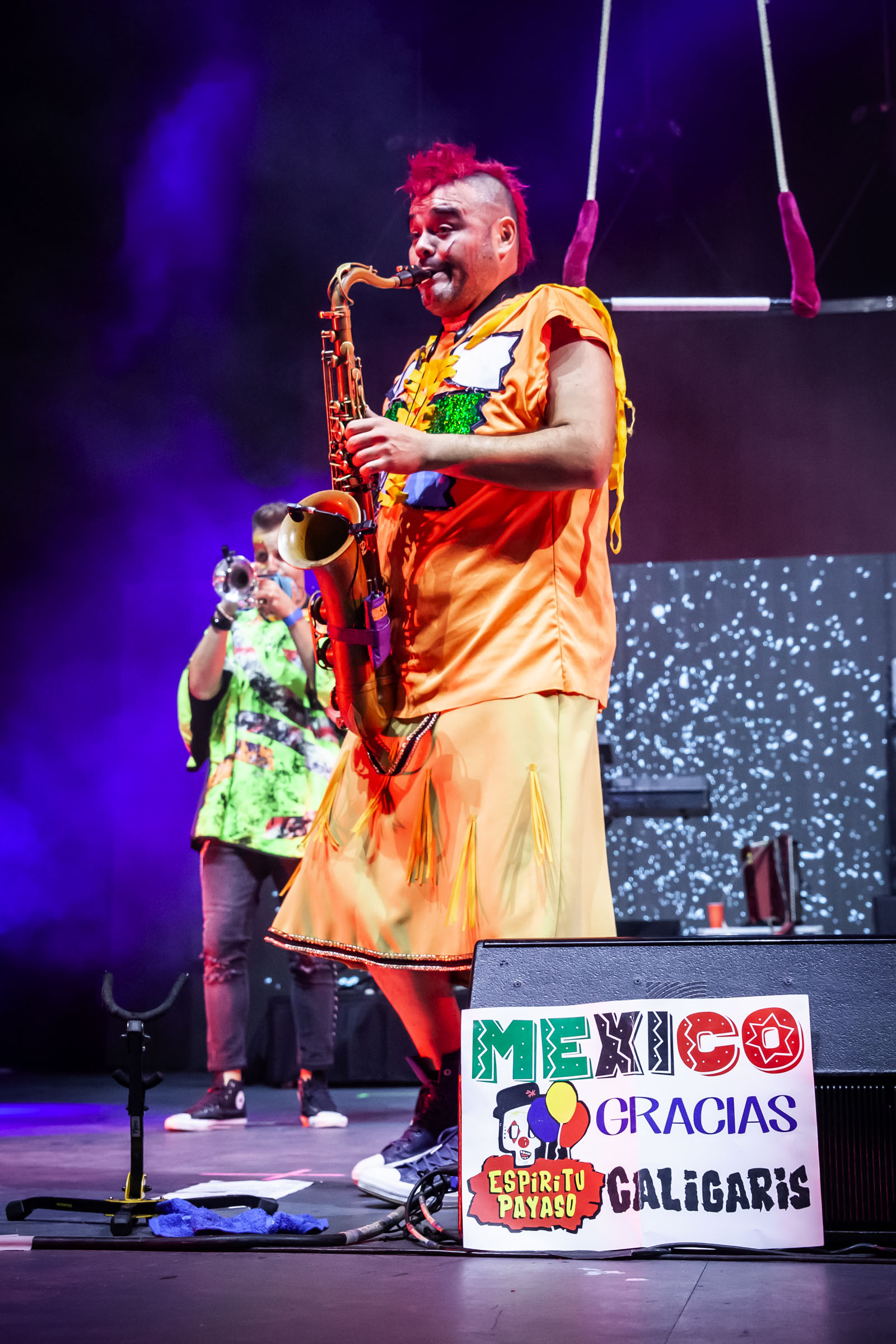 Enseguida, se pusieron Todos locos, brincando la mayoría desde el trampolín; Añejo W, en donde una parte del escenario se convirtió en una barra de bar, desde donde se reafirmó a voz en cuello: “¡Qué viva el circo, que viva la alegría!” y Tyson, donde la batería se ubicó sobre una de las pantallas.