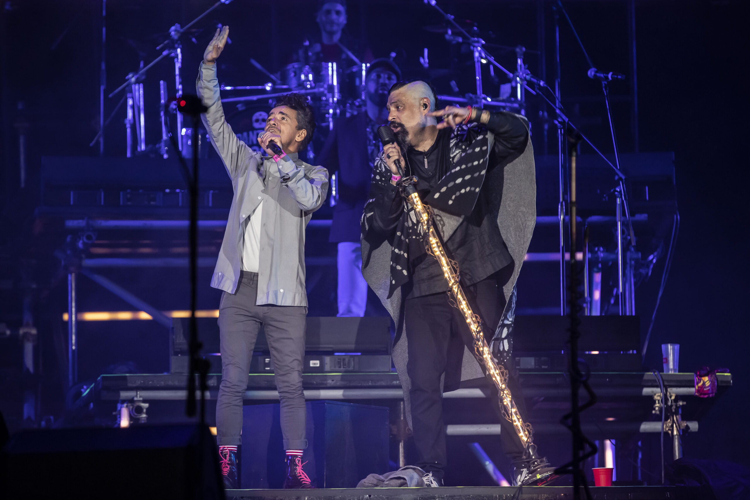 “Buenas noches gente del mundo que se dio cita aquí en este magno lugar para celebrar casi 27 años de lo que ha sido una aventura musical inusitada. Una relación hermosa entre ustedes y nosotros que se ha tejido a través del amor, de las canciones y de la resistencia”, dijo el vocalista de Panteón Rococó en el arranque del festejo de El Cuarto del Siglo, en el que la banda no sólo agasajó a sus fanáticos, sino que también abordó temas sociales como la migración –“Siempre he insistido que es un derecho inherente de cualquier ser humano, que se debe respetar, no importa si es por huir de algo, si es por hambre o si es turísticamente”, dijo Shenka- y la desaparición forzada.