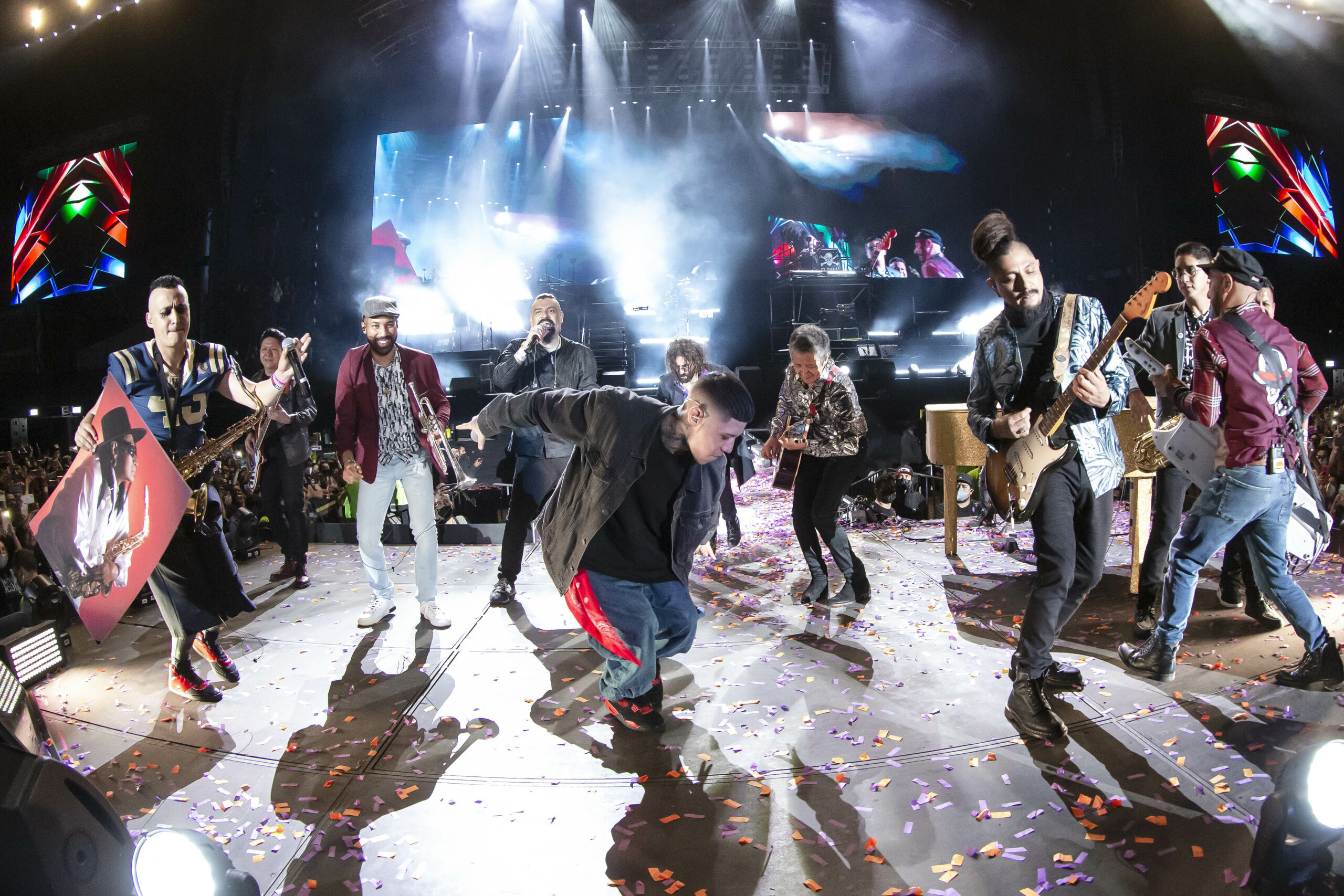 Panteón Rococó rindió homenaje al ‘Charro de Huentitán’ durante su tercero y último concierto con el que celebraron ‘El Cuarto de Siglo’ de la banda en el Foro Sol, el 12 de diciembre de 2021. Foto cortesía Ocesa / Lulú Urdapilleta