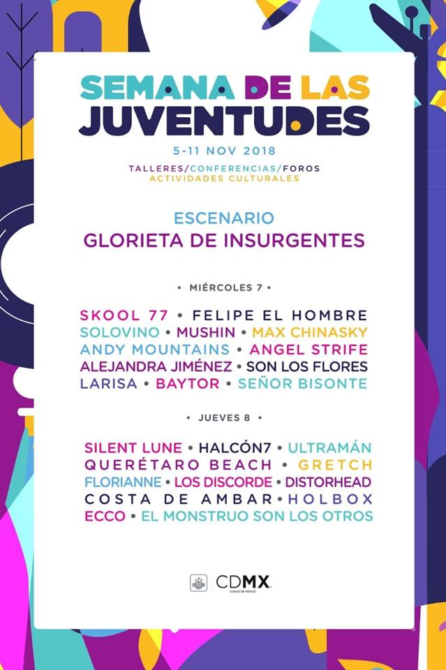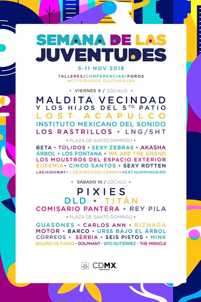 El grupo estadounidense Pixies y los mexicanos de La Maldita Vecindad y Los Hijos del Quinto Patio encabezan el cartel de la Semana de las Juventudes 2018, cuyas actividades se realizarán, de manera gratuita, del 5 al 11 de noviembre en la ciudad de México.