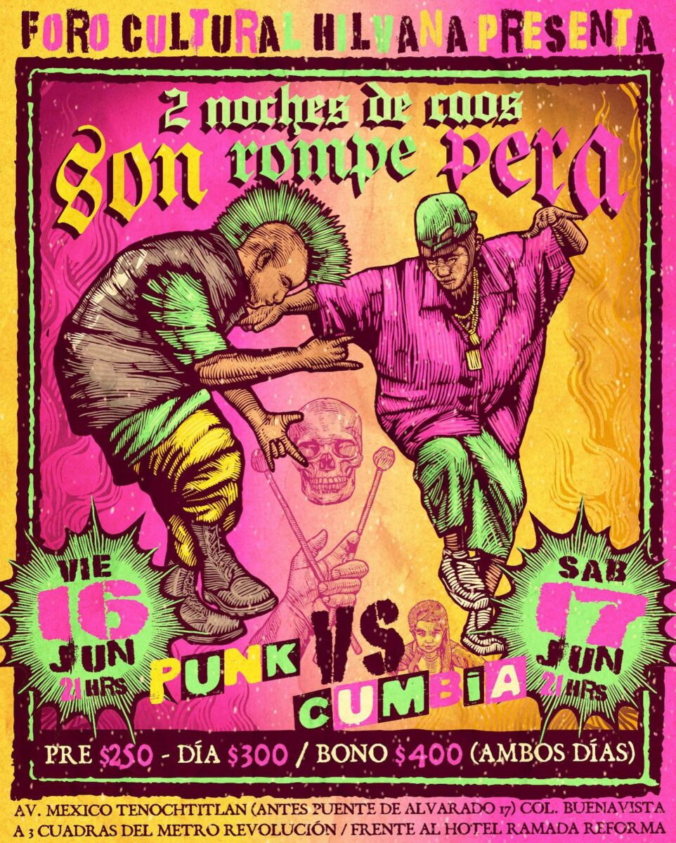 Y viceversa. La energía que genera la banda, también integrada por Ángel, alias Murfy -en las percusiones-, Raúl -bajo- y Ritchie -batería- durante sus presentaciones nunca desciende. Por el contrario, la velocidad y la potencia con la que son interpretados sus temas contagian a la audiencia que responde con cánticos, headbanging y hasta “ruedas de baile”, aunque el espacio sea breve, como en el Lunario, donde al grito de “¡Arriba la cumbia!”, el recital siguió con La Muerta del Amor, Proteus y una petición hecha coro multitudinario: “Quiero un buen tamal de Bogotá para Naucalpan”, fragmento de la canción El Tamal, para la que invitaron a integrantes de La Pila.