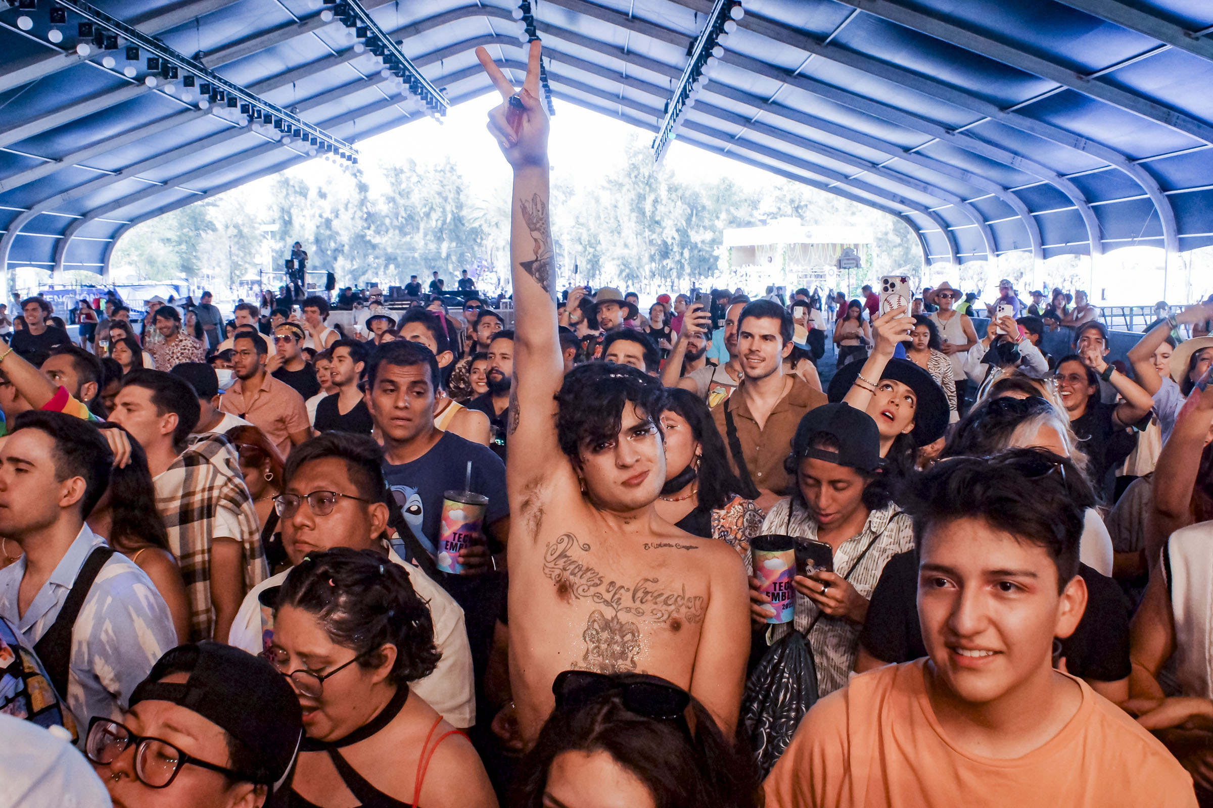 “¿Nos vamos pa’l hoyo? Que conste. Luego no digan que les tumbé el evento”, expresó antes de interpretar Amantes y Amigos, que desató una ovación, tras la que declaró “amo que nosotros estemos en nuestro hoyo emocional y por allá estén festejando”, dijo señalando hacia el escenario Tecate donde actuaba Danna Paola.