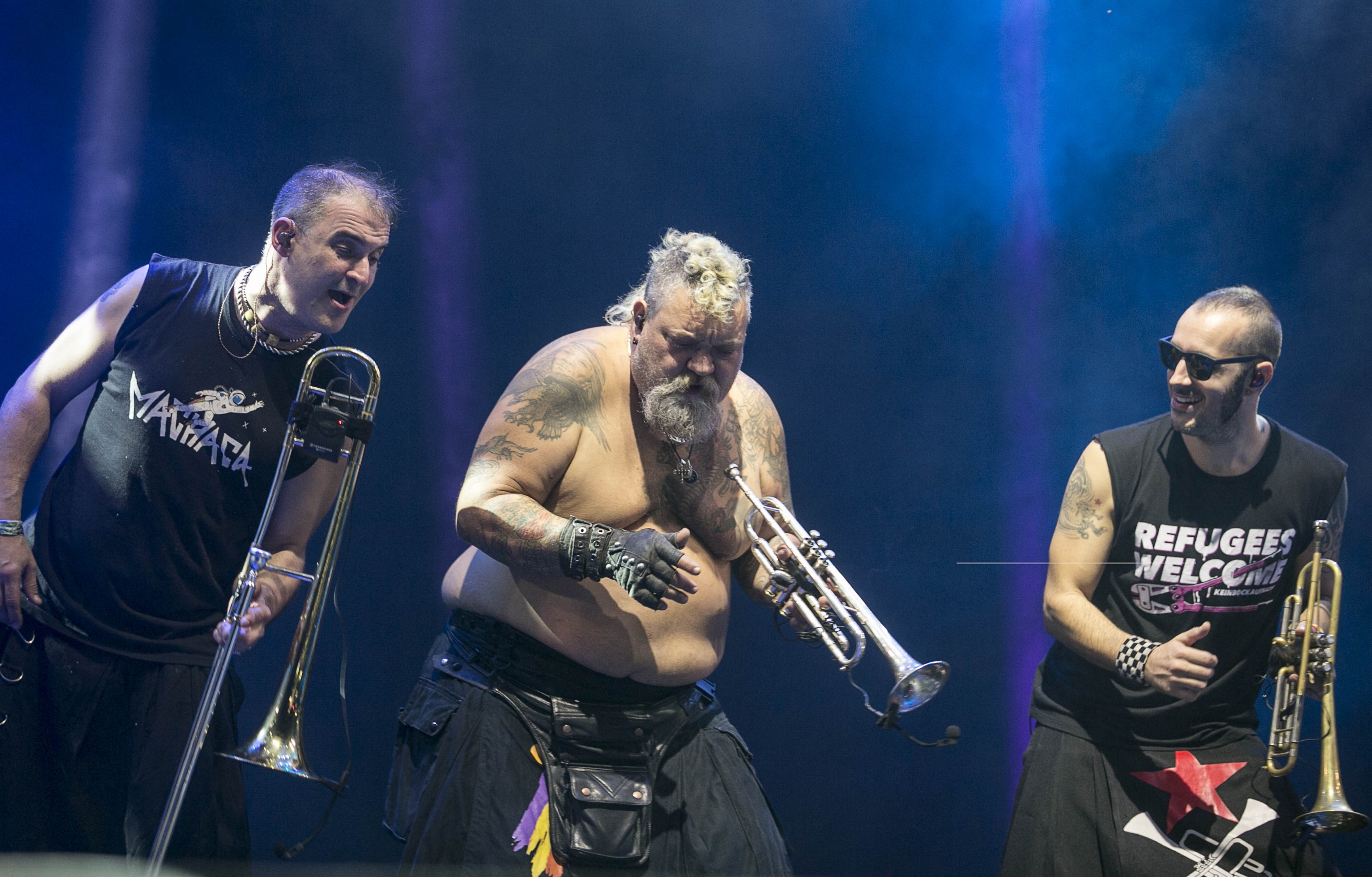 Los españoles acapararon toda la atención del respetable y lo hicieron contorsionarse con su propuesta de ska punk. “Gritaré que ardan las banderas por la fraternidad || que caiga el patriotismo y la hostilidad racial || Cultura Popular”, gritaba la multitud, para hacer coro a la canción Mestizaje, a la que siguió Jaque Al Rey -en la que apareció uno de los integrantes de la banda liderada por Pulpul (Roberto Gañán) vestido como un personaje perteneciente a la realeza; seguido de un torero, quien anunció así el turno a la crítica a la “fiesta brava” contenida en la canción Vergüenza.