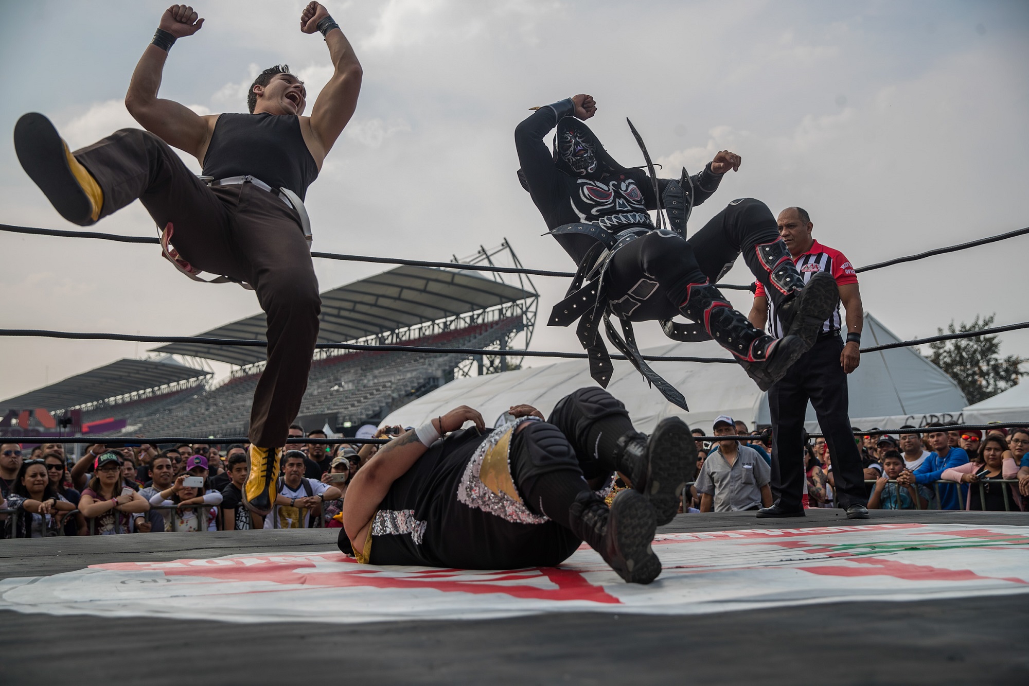 Alguien disfrazado de ‘El Santo’ recorre en las alturas, con ayuda de un arnés, el Foro Sol, el 16 de de marzo de 2019. Foto Cortesía Ocesa / Lulú Urdapilleta
