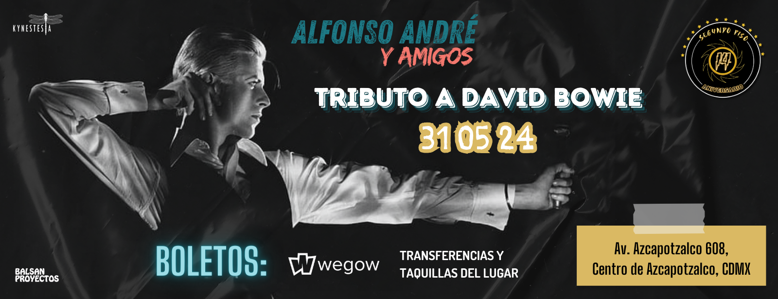 Alfonso André retoma su tributo a David Bowie para cerrar, este viernes, la serie de fiestas por el 14 aniversario del Segundo Piso Live, un foro independiente ubicado al norte de la Ciudad de México, que se caracteriza por su decoración vintage y su expresiva admiración hacia el llamado Duque Blanco.