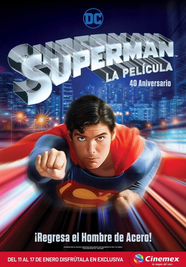 Para festejar las cuatro décadas de Superman en la pantalla grande, la cadena Cinemex ofrecerá funciones especiales durante el mes de enero, a partir de este viernes 11, en complejos de más de 38 ciudades de la República Mexicana.