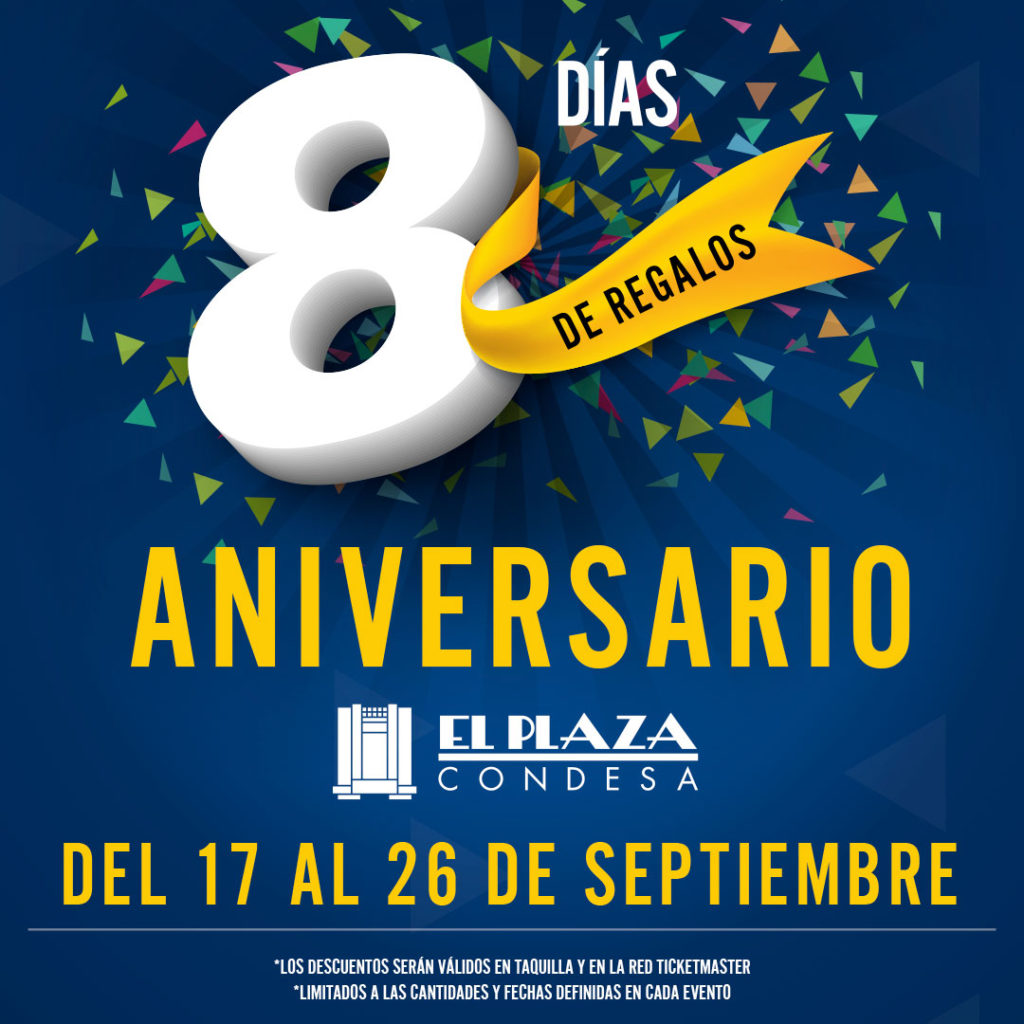 Considerado uno de los mejores recintos de conciertos en todo el país, según la revista Pollstar*, el auditorio El Plaza Condesa celebró este fin de semana su octavo aniversario y lo celebrará en grande: con ¡ocho días de promociones y descuentos en todos sus shows!