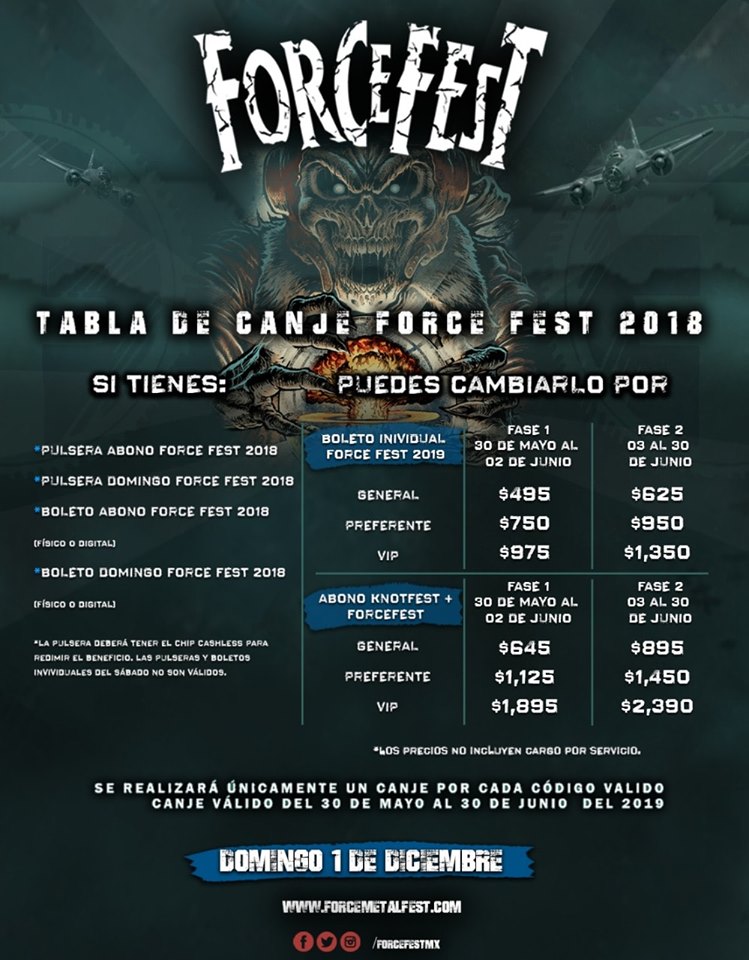 Por otro lado, en el caso del Force Fest, aquellos que conserven “su pulsera o boleto (digital o físico) abono o individual de domingo -de la edición de2018- podrán canjearlo por un acceso para la edición 2019 a través de la página de Stubhub o en las taquillas del Frontón México. Tendrán oportunidad de cambiar el acceso hasta el 2 de junio. “¡Recuerda que las cortesías no son válidas!”, resalta la página oficial del encuentro musical en Facebook.