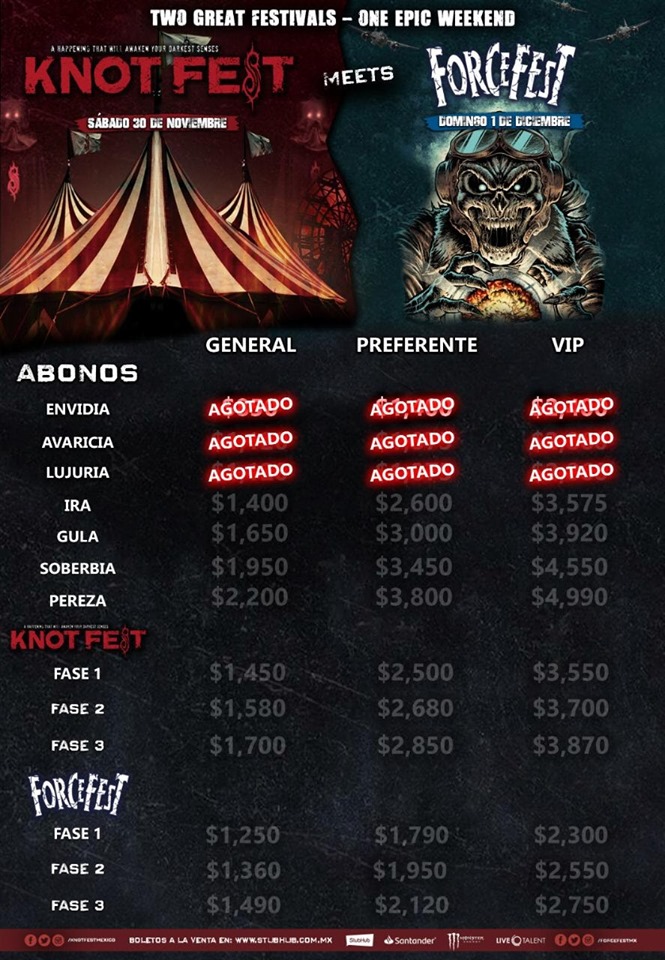 Aun sin dar a conocer en qué foro tendrá lugar, los organizadores señalan que el evento, conocido bajo el nombre Knotfest meets Force Fest, “promete ser el acontecimiento musical del año”, para el cual los boletos -en modalidad de abono– han estado disponibles en diversas etapas de venta a través de la página de Stubhub desde el pasado 30 de mayo cuando inició la fase denominada Early Bird¸ en su primera parte, llamada Envidia.