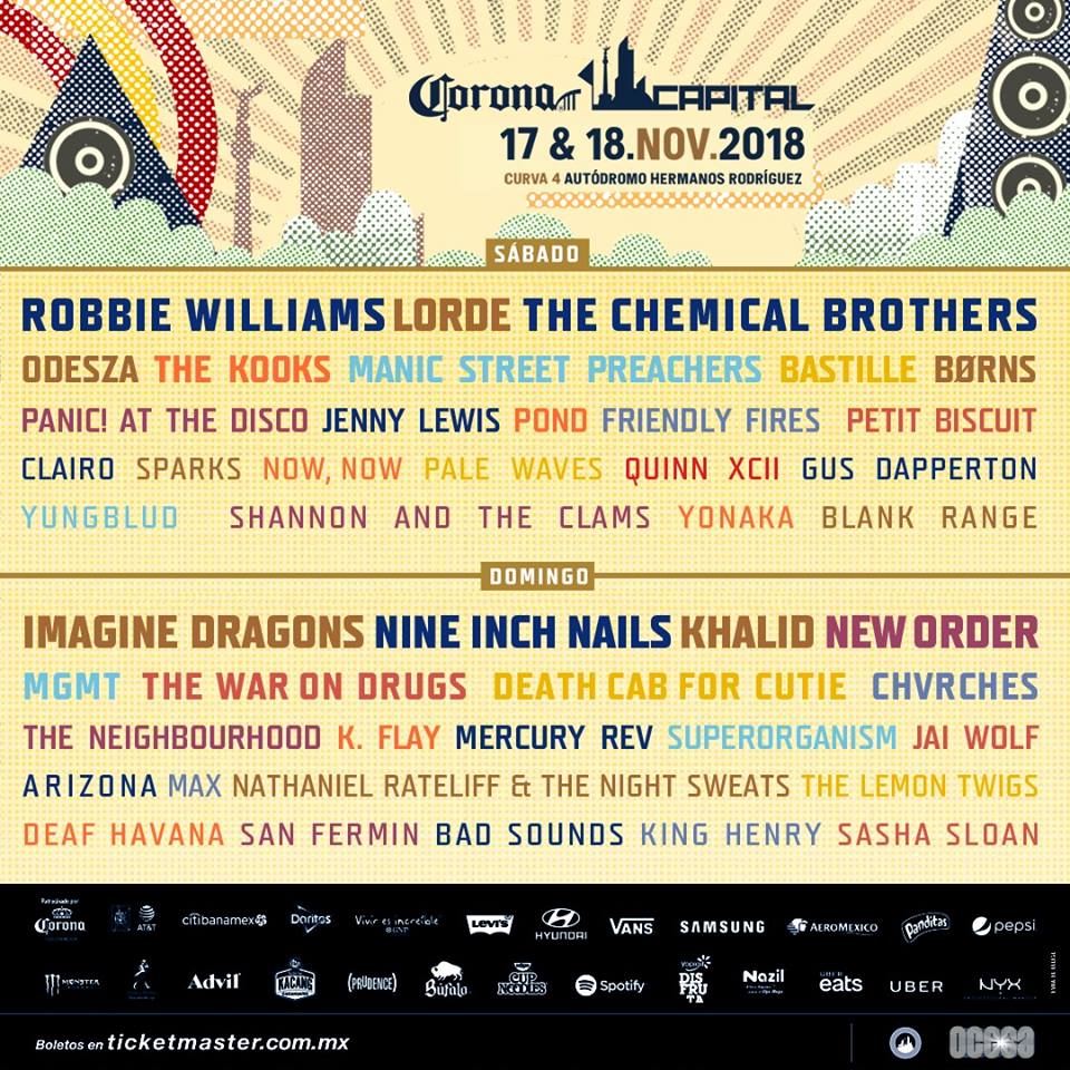 Actualización. El Festival Corona Capital reveló el elenco que dará vida a su novena edición, la cual se llevará a cabo los días 17 y 18 de noviembre en la Curva 4 del Autódromo Hermanos Rodríguez, y que tiene como líderes al inglés Robbie Williams y los estadounidenses Imagine Dragons y Nine Inch Nails.