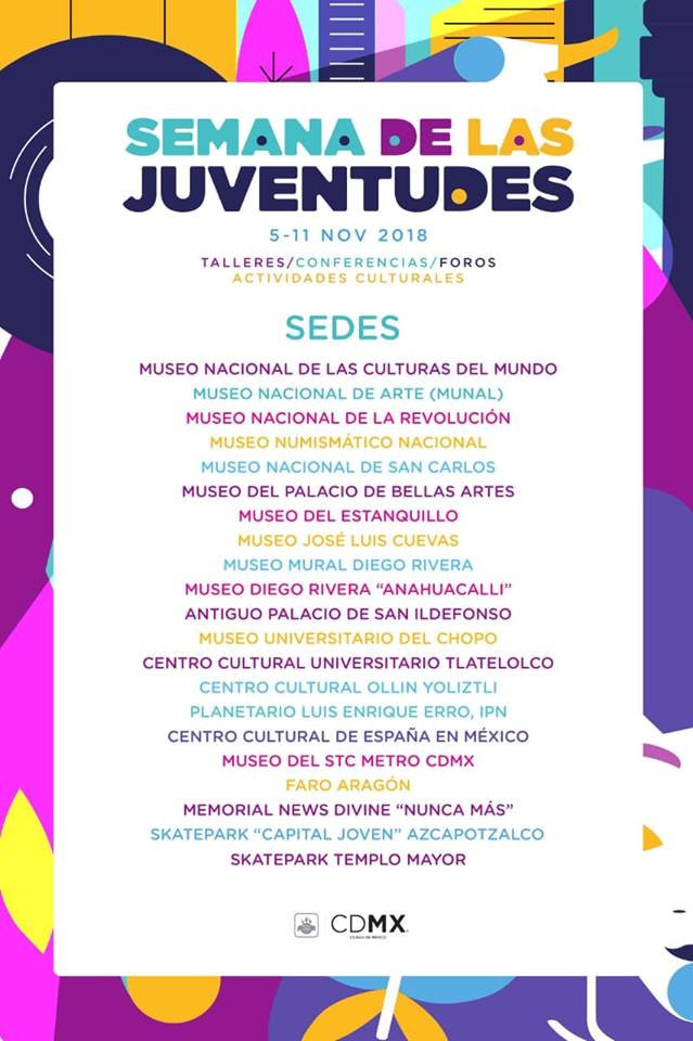 La cartelera de todos los eventos puedes consultarla en el sitio web www.injuve.cdmx.gob.mx, www.facebook.com/INJUVECDMXoficial/ y en la cuenta de Twitter @InjuveCDMX. Aquí te compartimos las sedes de donde se realizarán los talleres, foros y conferencias de esta edición: