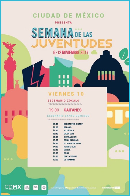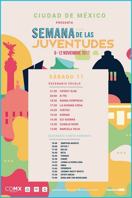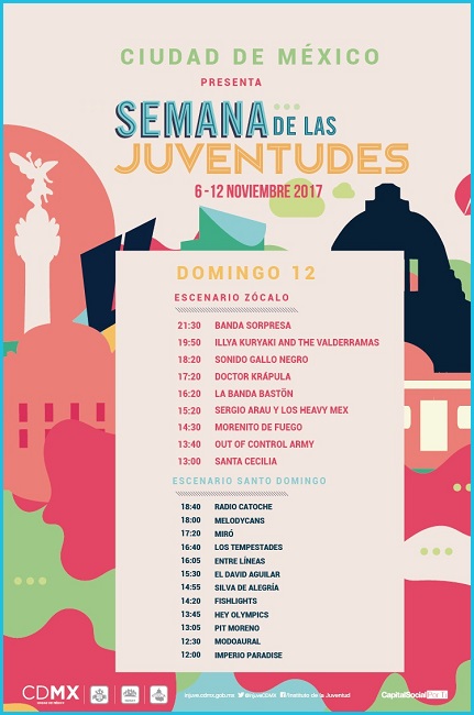 Actualizada. El Instituto de la Juventud de la Ciudad de México (Injuve CDMX) reveló ayer el cartel que dará vida, en el ámbito musical, a la Semana de las Juventudes, la cual se celebrará del 6 al 12 de noviembre de este año y cuyas sedes para los conciertos serán el Zócalo y la Plaza de Santo Domingo, en el Centro Histórico……