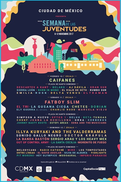 El grupo Caifanes, el inglés Fatboy Slim y los argentinos Illya Kuryaki & The Valderramas son los artistas que encabezarán las presentaciones los días 10, 11 y 12 de noviembre en la Plaza de la Constitución; y compartirán escenario con bandas como Descartes a Kant, Belako, Gran Sur y otras, el viernes; El Tri, La Gusana Ciega, Chetes y más el sábado; así como Sonido Gallo Negro, Doctor Krápula, La Banda Bastön y algunos otros el domingo.
