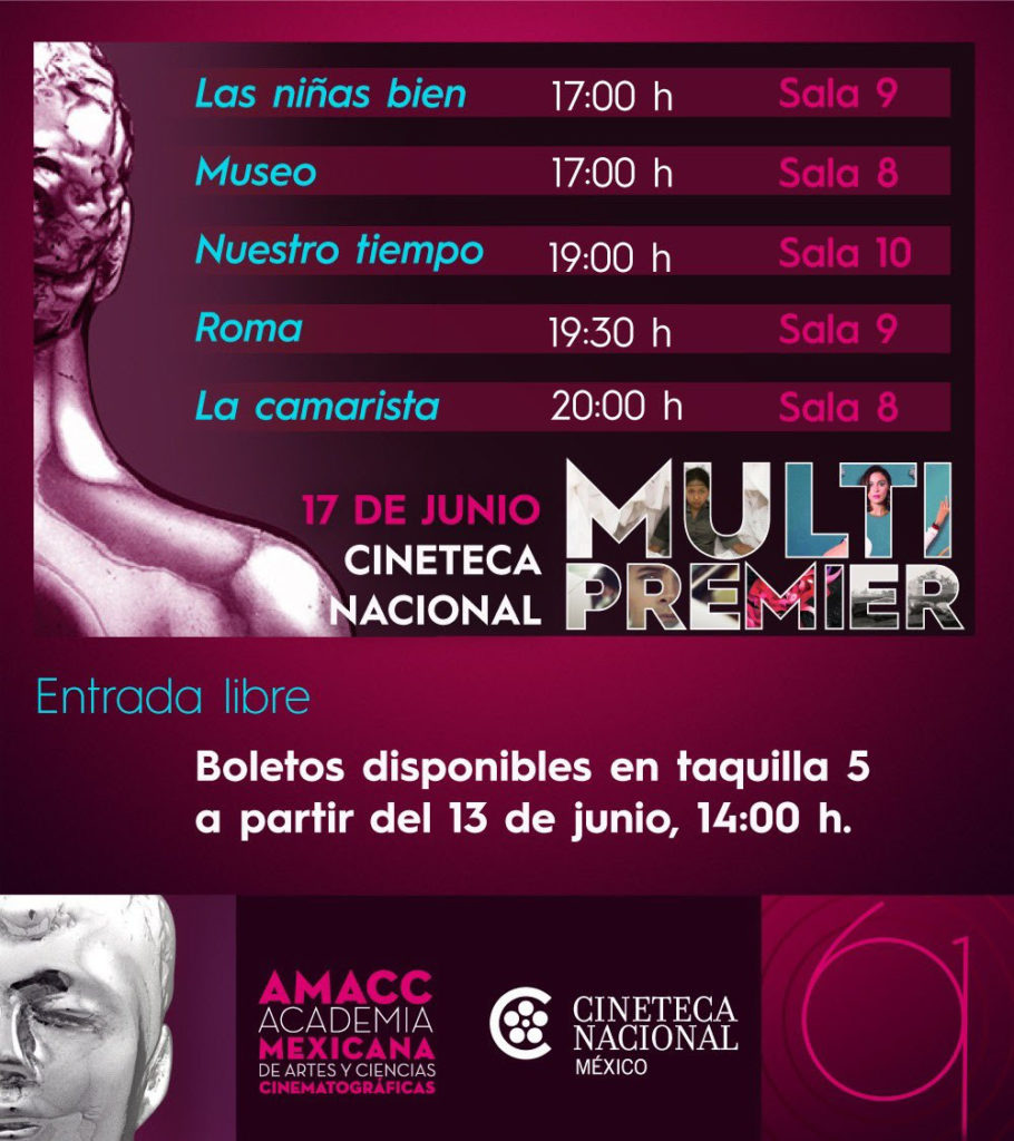 Así, la Multipremier tendrá lugar el 17 de junio en la Cineteca Nacional a partir de las 17:00 horas. Las cintas que se exhibirán son las siguientes: